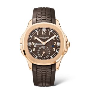 The Patek Philippe Aquanaut Travel Time (5164R) is luxury redefined for the globetrotter. Crafted from 18k rose gold, it boasts a sporty brown polymer strap for comfort and durability. Showcasing two time zones at once, it keeps you organized wherever you roam. Water-resistant for aquatic adventures, a sapphire crystal ensures perfect clarity.