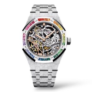 The Audemars Piguet Royal Oak 37mm 15468BC.YG.1259BC.01 is a breathtaking fusion of artistry and luxury. Crafted from hammered white gold, this timepiece showcases the iconic Royal Oak design with a vibrant rainbow diamond-set bezel, radiating elegance and individuality.