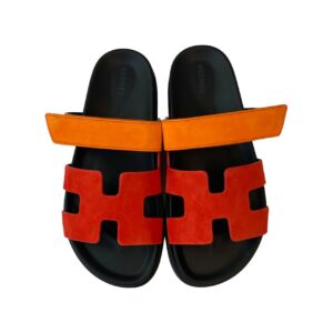 The Hermes Chypre Sandals feature a striking Orange Canyon suede finish, embodying both luxury and comfort. Perfect for adding a stylish and sophisticated touch to your casual summer wardrobe.