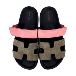 The Chypre Hermes suede sandals in Pink and Vert Toundra are a testament to elegance and timeless style. Made from high-quality suede, these sandals boast a luxurious and supple feel that molds to the foot for ultimate comfort.
