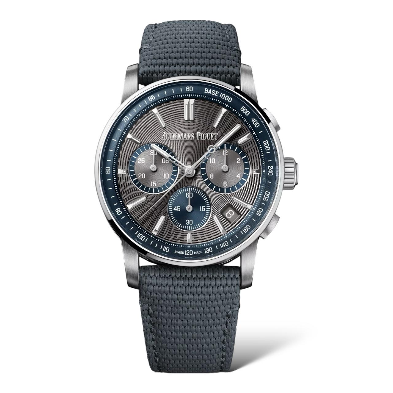 The Audemars Piguet Code 11.59 Selfwinding Chronograph is a 41mm stainless steel timepiece that combines modern design with technical sophistication. Its grey embossed dial features blue accents and is complemented by 18-carat white gold luminescent hour markers and hands.