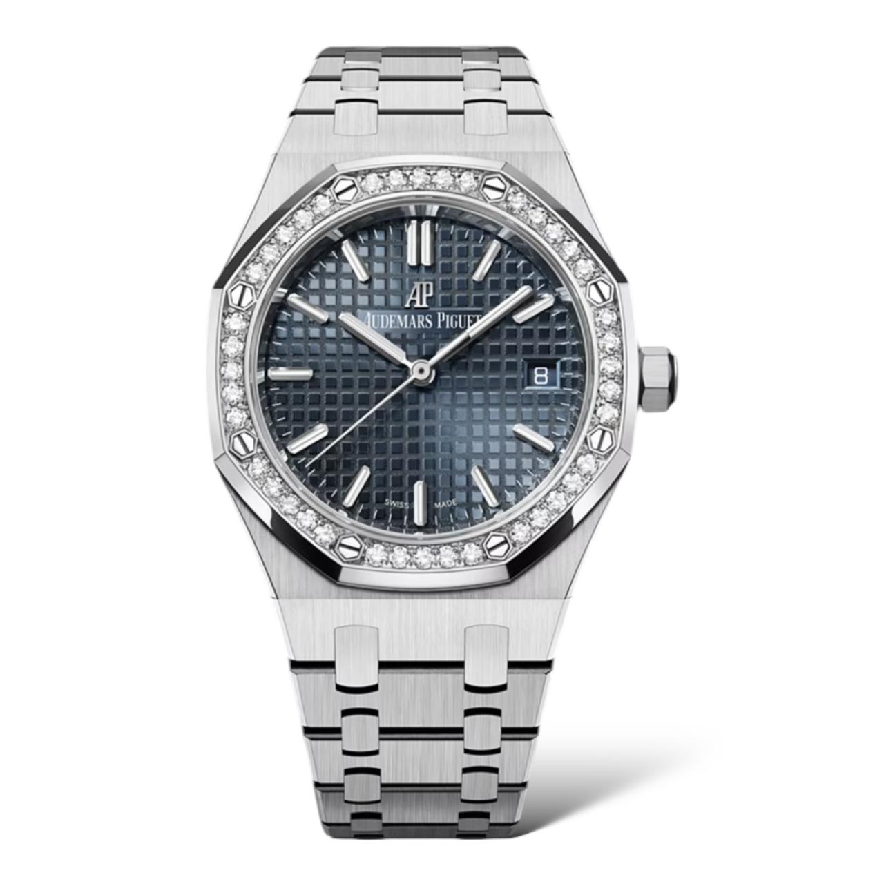 This elegant timepiece combines the iconic Royal Oak design with a touch of luxury. The 34mm stainless steel case features a stunning blue-grey dial and a diamond-set bezel, adding a touch of glamour.