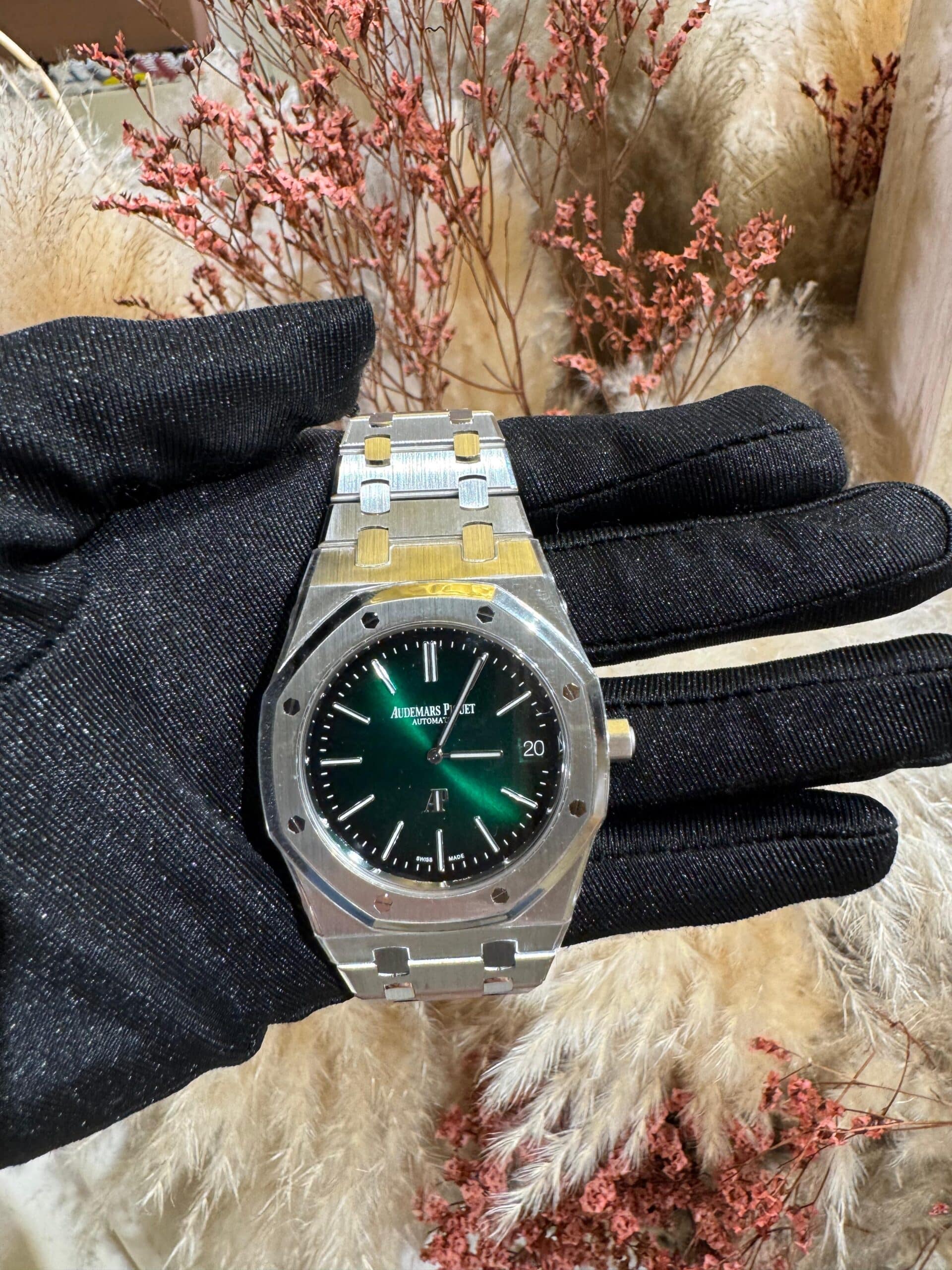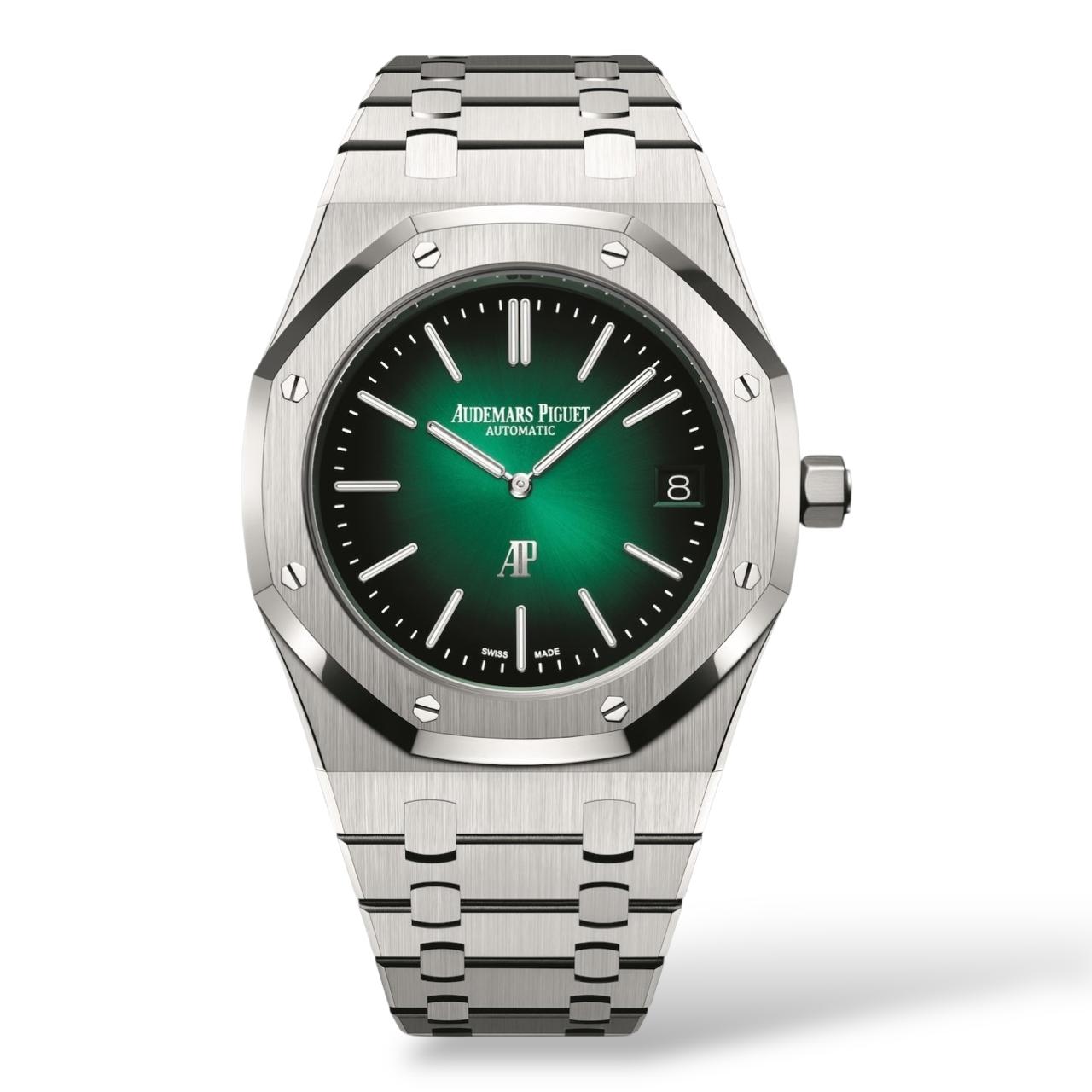 A supremely refined 39 mm platinum Royal Oak for its 50th anniversary—featuring an enchanting green dial, ctting-edge ultra-thin movement, and exclusive BMG bezel; the ultimate blend of iconic design and modern elegance