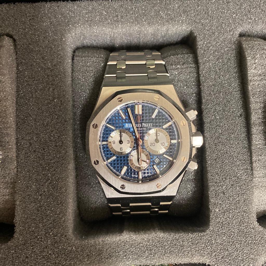 The blue “Grande Tapisserie” dial is a visual feast, its textured pattern playing with light and shadow. White gold hour markers and Royal Oak hands, coated with luminescent material, ensure effortless readability in any setting.