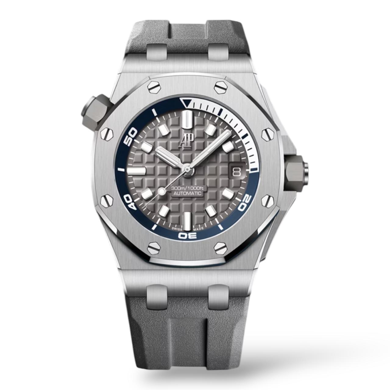 The Audemars Piguet Royal Oak Diver is a testament to both elegance and extreme performance. This 42mm stainless steel timepiece features the iconic octagonal bezel, now with a unidirectional rotating bezel for precise dive timing. The sleek grey dial and robust construction make it ideal for both underwater adventures and everyday wear. This is a watch for those who demand both style and exceptional functionality.