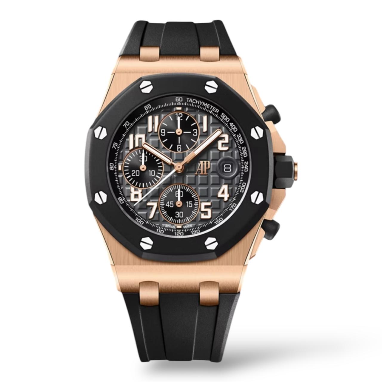 The Audemars Piguet Royal Oak Offshore Chronograph is a bold and luxurious timepiece. Its 42mm 18k rose gold case, featuring the iconic octagonal bezel with exposed screws, showcases the brand’s signature design. Powered by a self-winding chronograph movement, this watch combines robust performance with refined elegance.