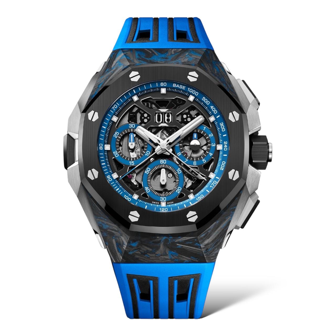 This 43mm carbon watch features blue luminescent accents, a black ceramic bezel, and an openworked dial with split-seconds chronograph, GMT, and large date. Powered by the self-winding Calibre 4407, it comes on a blue and black rubber strap.