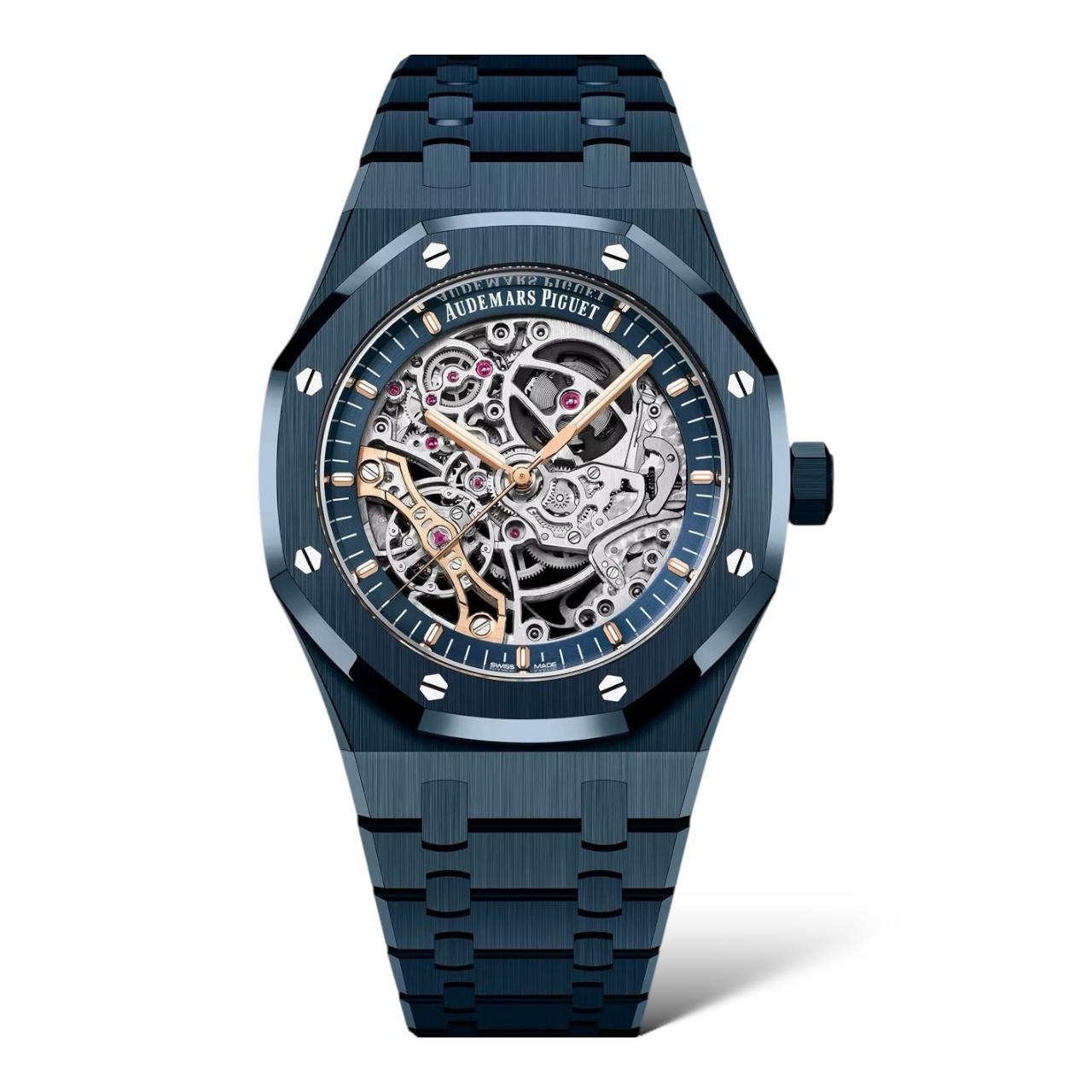 The Audemars Piguet Royal Oak is a 41mm openworked watch crafted entirely in deep blue ceramic. It features the selfwinding Calibre 3132 with a double balance wheel for enhanced precision, accented by pink gold hands and markers. Bold, technical, and highly refined.