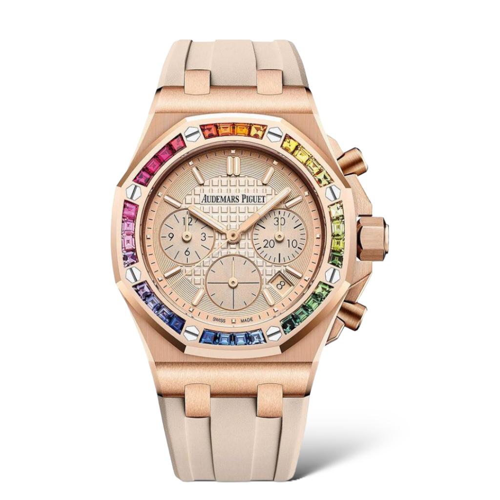 This timepiece is a true marvel. The 18-carat pink gold case boasts a stunning rainbow-colored bezel set with an array of vibrant sapphires, creating a spectacular and distinctive aesthetic.
