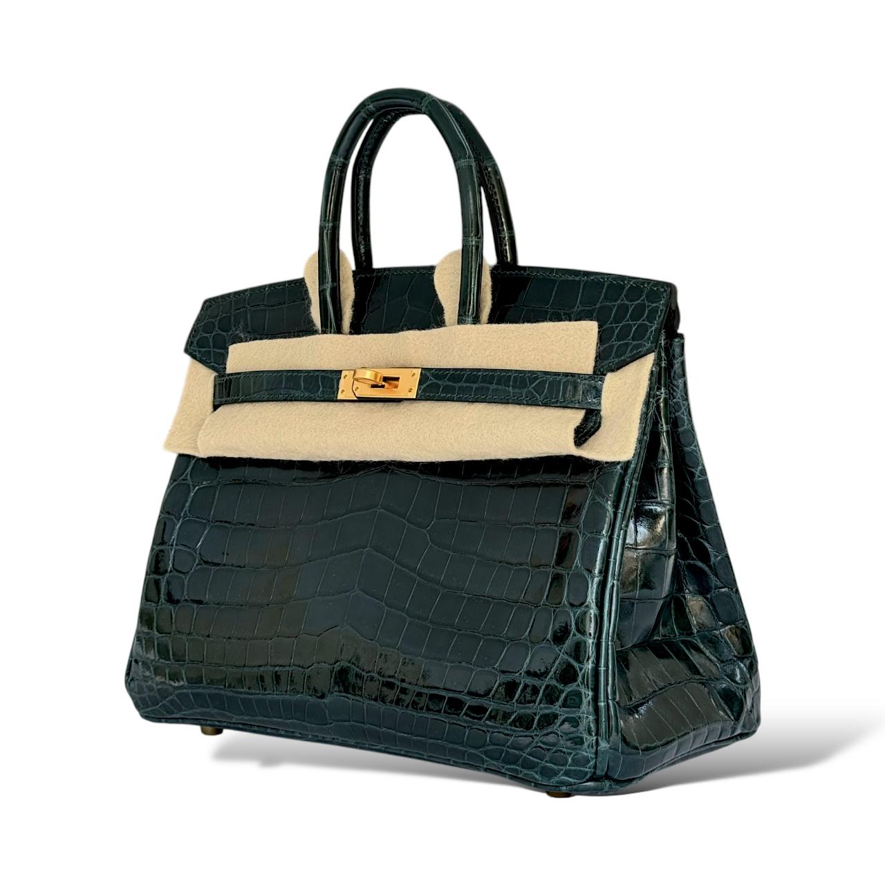 The Birkin 25 Vert Cypress Shiny Croco GHW is a luxurious and compact version of the iconic Hermès Birkin bag. Made from glossy, textured crocodile leather in a rich green “Vert Cypress” hue, it features gold-tone hardware (GHW), which adds an elegant contrast to the deep color. This 25 cm size offers a refined and sophisticated look, perfect for those seeking a high-end, statement accessory.