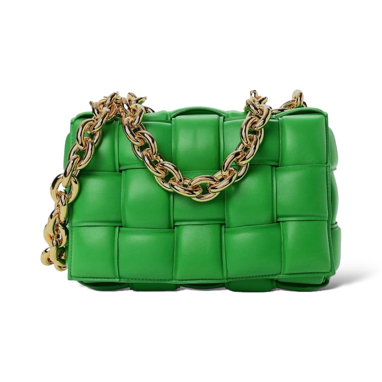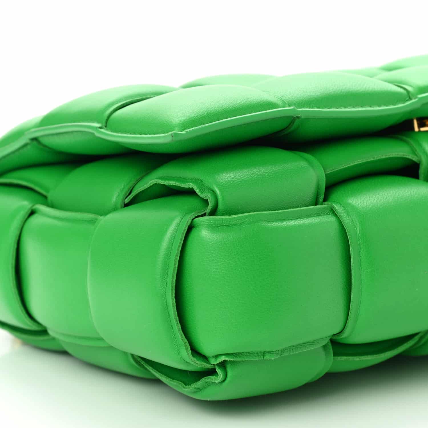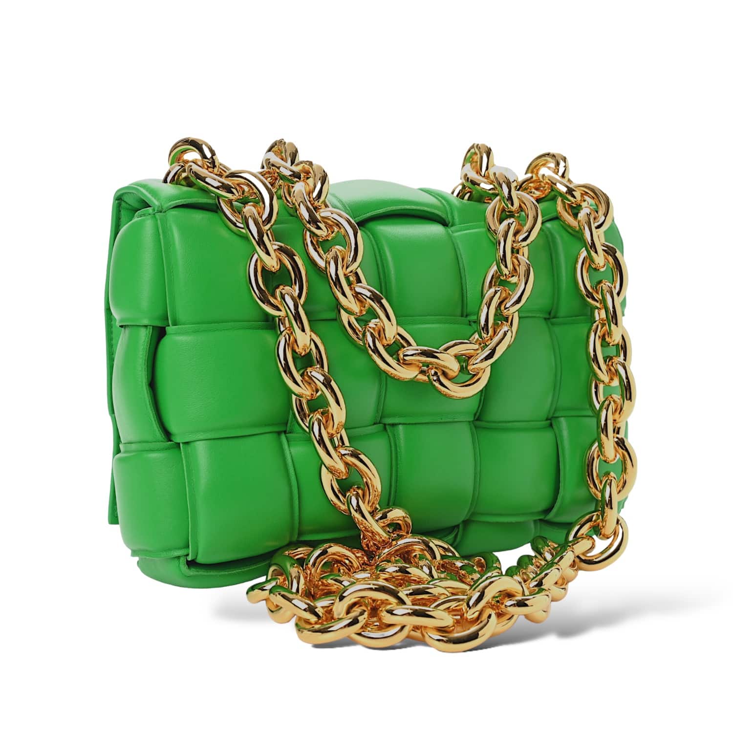 The Bottega Veneta Green Padded Leather Chain Cassette Shoulder Bag is a luxurious and stylish accessory crafted by the renowned Italian fashion house, Bottega Veneta. This exquisite shoulder bag features a unique padded leather design in a vibrant green hue, adding a pop of color to any ensemble. The bag is adorned with a chunky chain strap, providing a modern and edgy touch to its classic silhouette. With its spacious interior and versatile design, the Bottega Veneta Cassette Shoulder Bag is perfect for both day and evening wear, making it a must-have addition to any fashion-forward wardrobe.