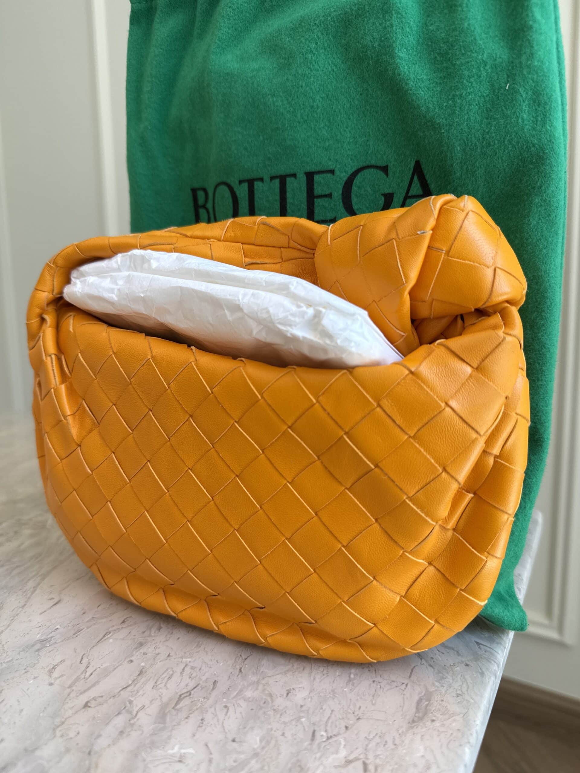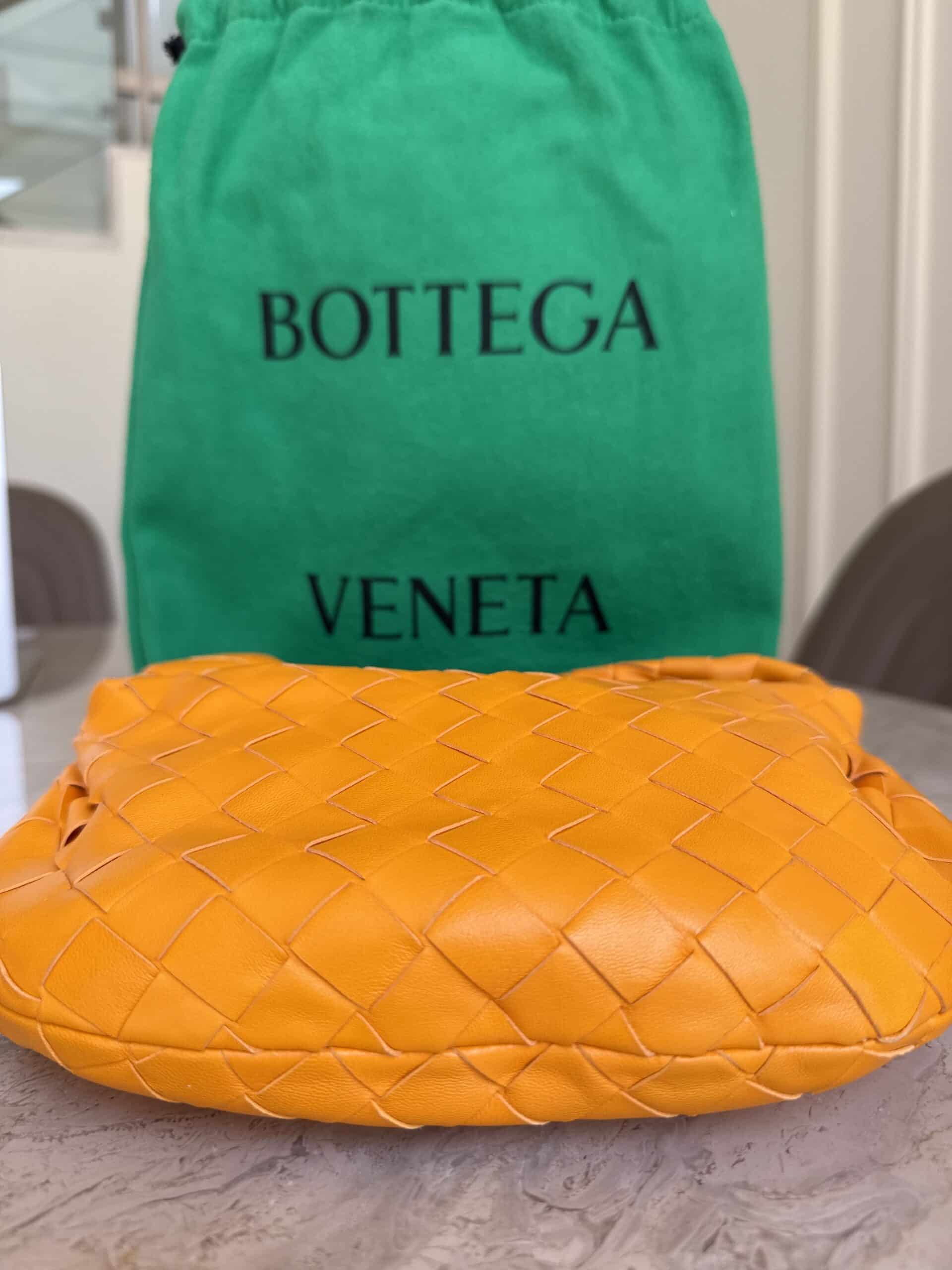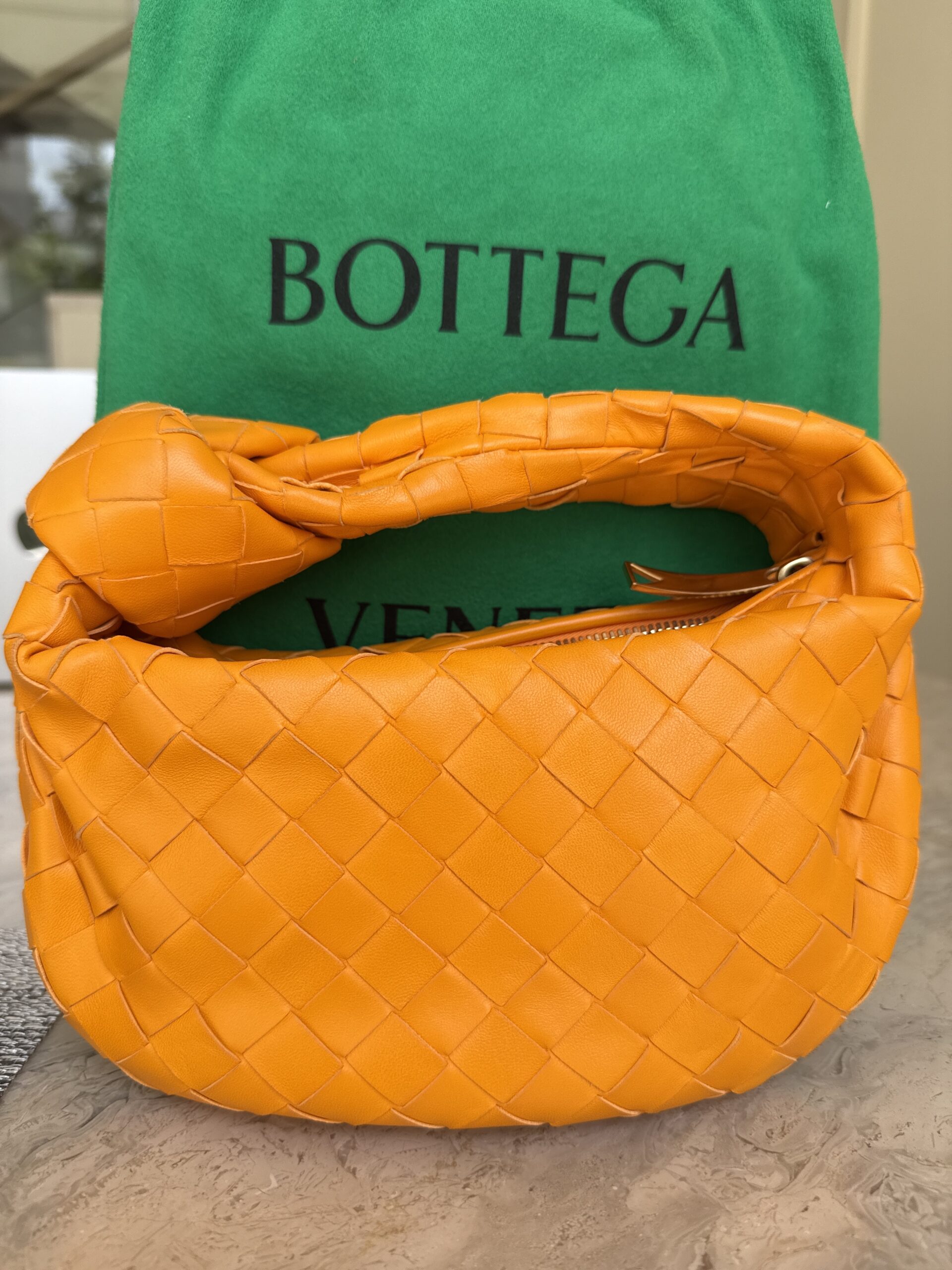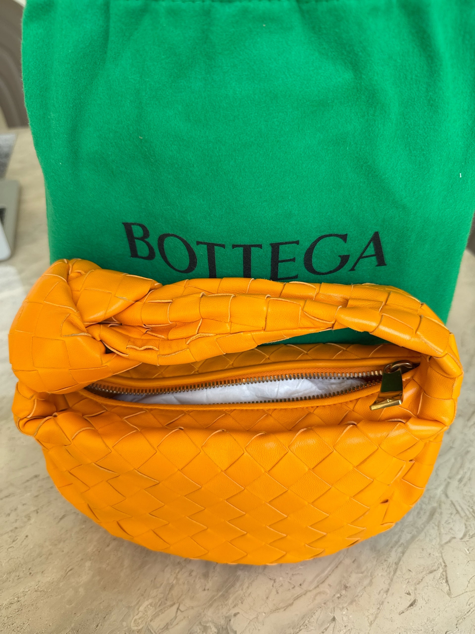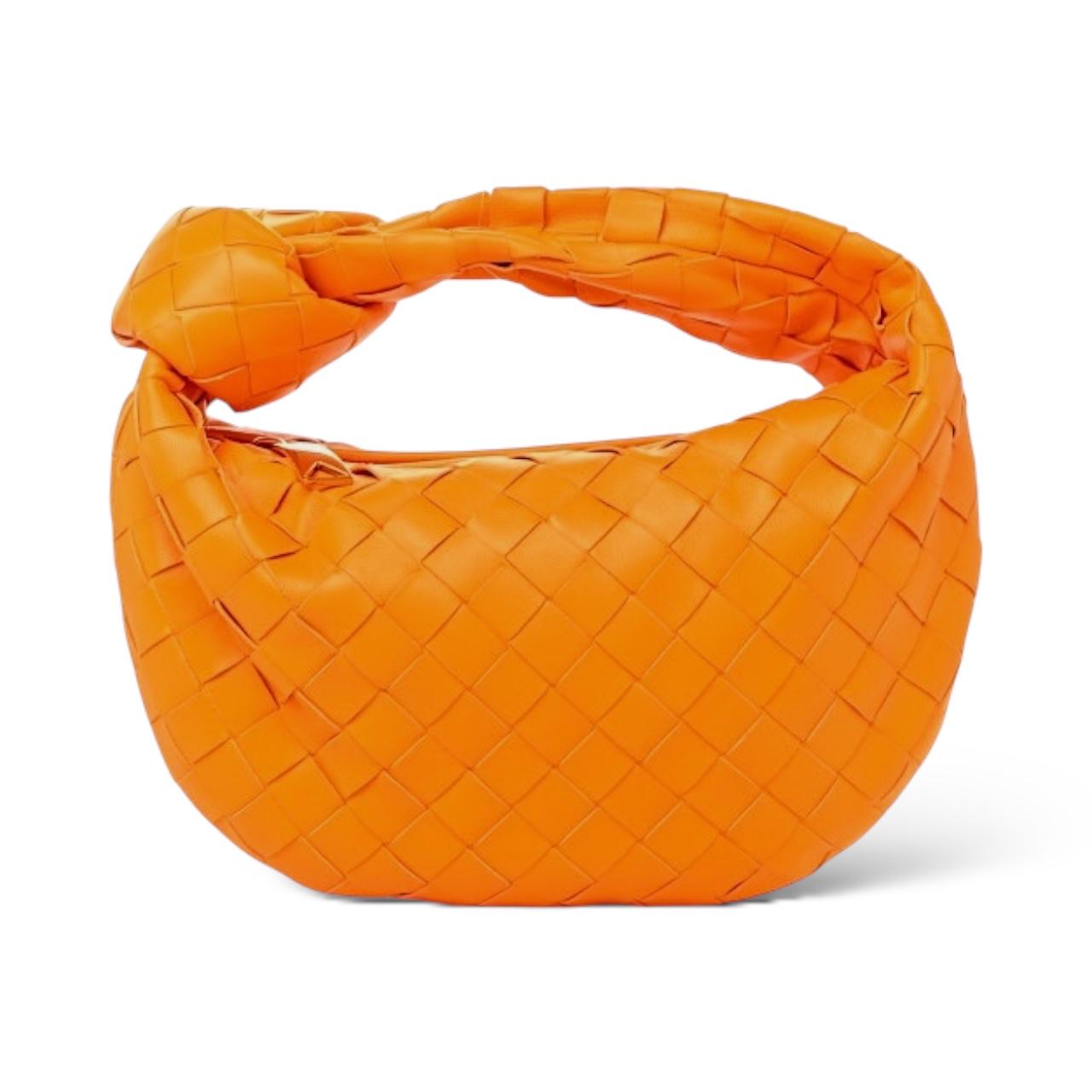 The Bottega Veneta Mini Jodie in orange is a compact hobo bag crafted from soft, hand-woven intrecciato leather. Featuring a signature knotted handle and bold color, it combines playful elegance with modern Italian craftsmanship.