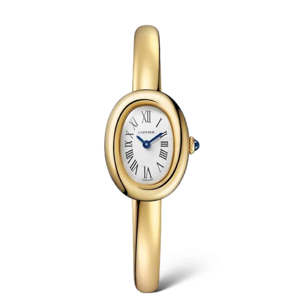 This exquisite timepiece features a sleek and slender yellow gold case, evoking a sense of understated glamour and refinement. The distinctive oval shape of the case, reminiscent of a luxurious bathtub (“baignoire” in French), adds a touch of whimsy to its classic design.