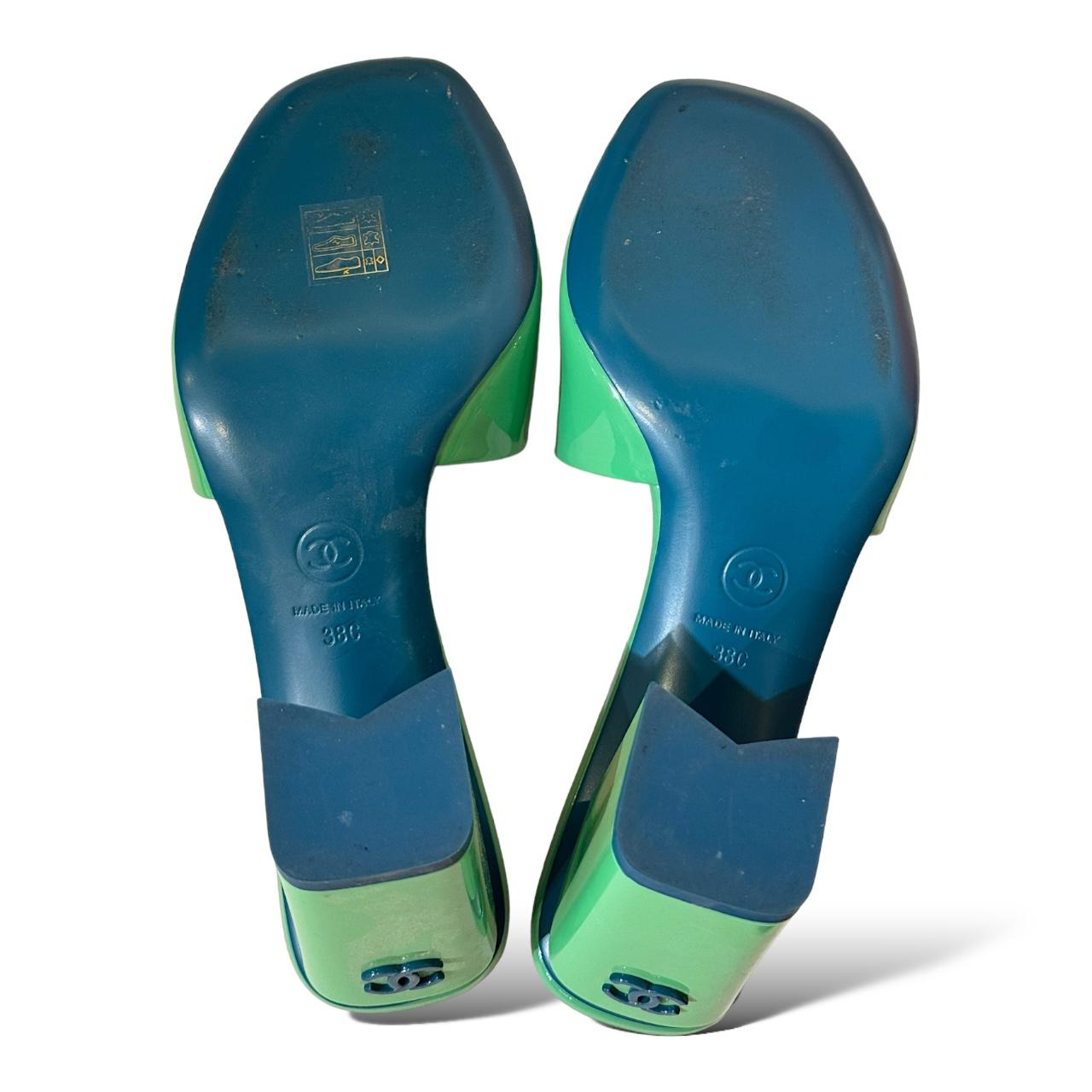 These stylish sandals from Chanel feature a refreshing mint green color adorned with the iconic blue CC logo. Crafted with attention to detail, they combine elegance and comfort, perfect for a chic summer look.
