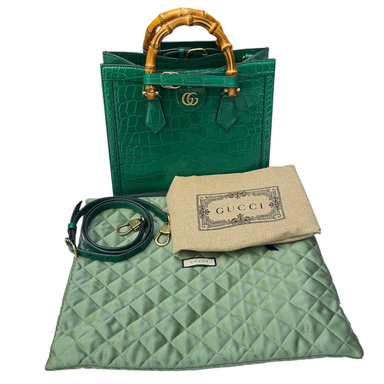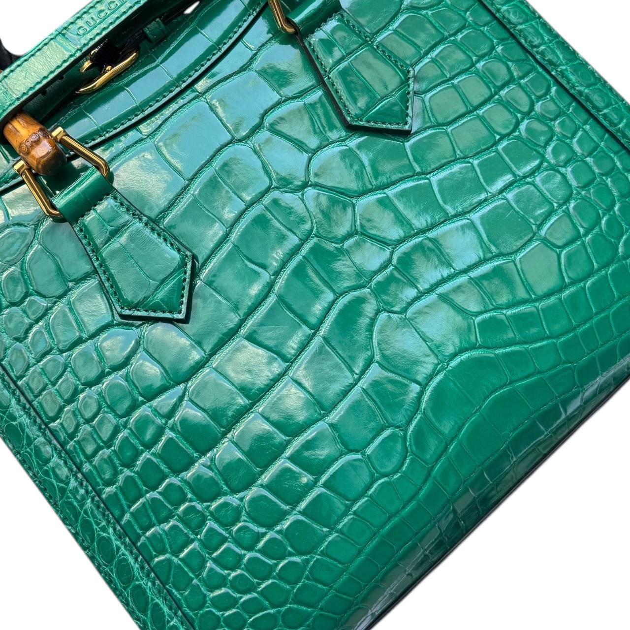 The Gucci Diana Small Croco Top Handle Bag in Emerald is a stunning and refined accessory that blends luxurious materials with iconic design. Crafted from emerald green crocodile leather, this bag exudes an air of exclusivity and sophistication. The rich, glossy texture of the croco leather catches the light beautifully, enhancing its vivid, jewel-toned hue that stands out in any setting, making it a true statement piece.