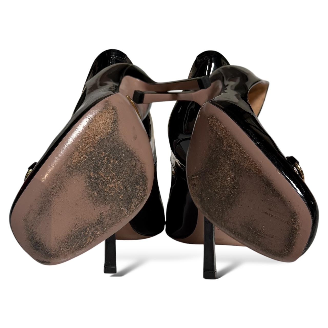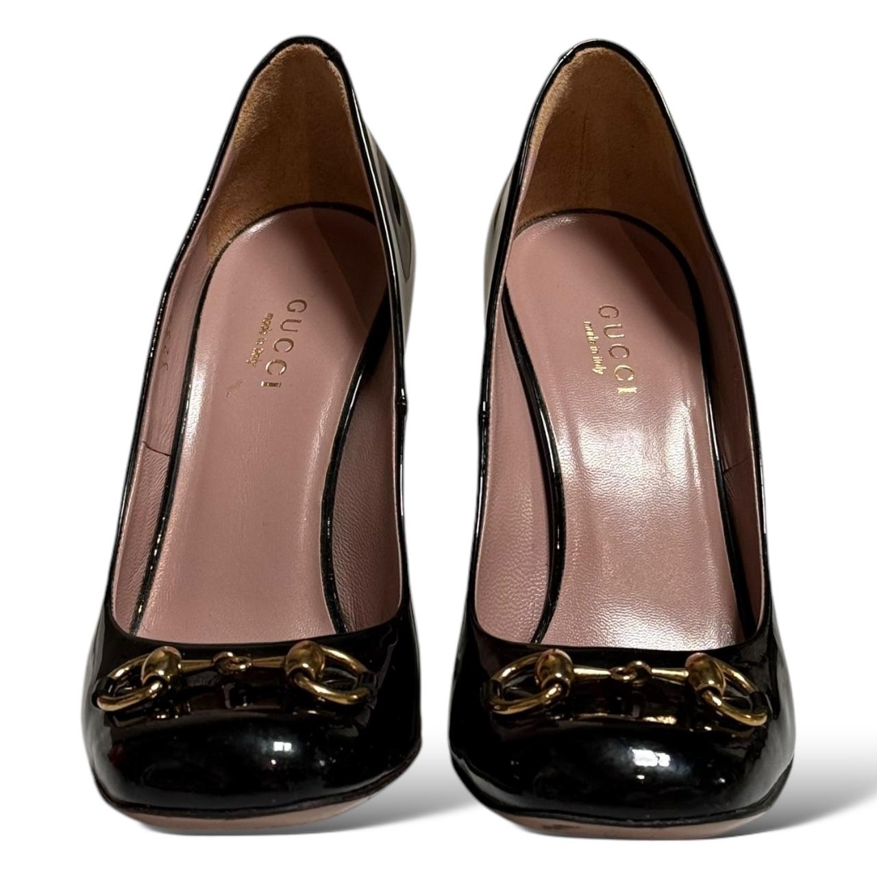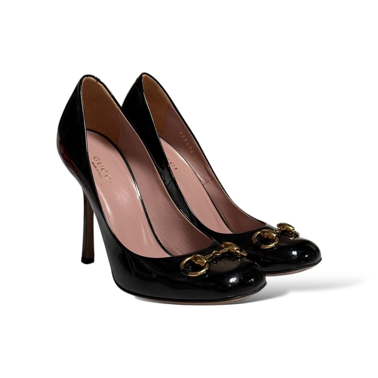 The GUCCI Horsebit Patent Leather Black Shoes feature a sleek black patent leather design with the iconic gold-tone horsebit hardware across the front. Combining luxury and sophistication, these shoes offer a polished look with a classic silhouette, perfect for both formal and casual occasions. The signature horsebit detail adds a touch of Gucci’s equestrian heritage to the modern, high-shine finish.