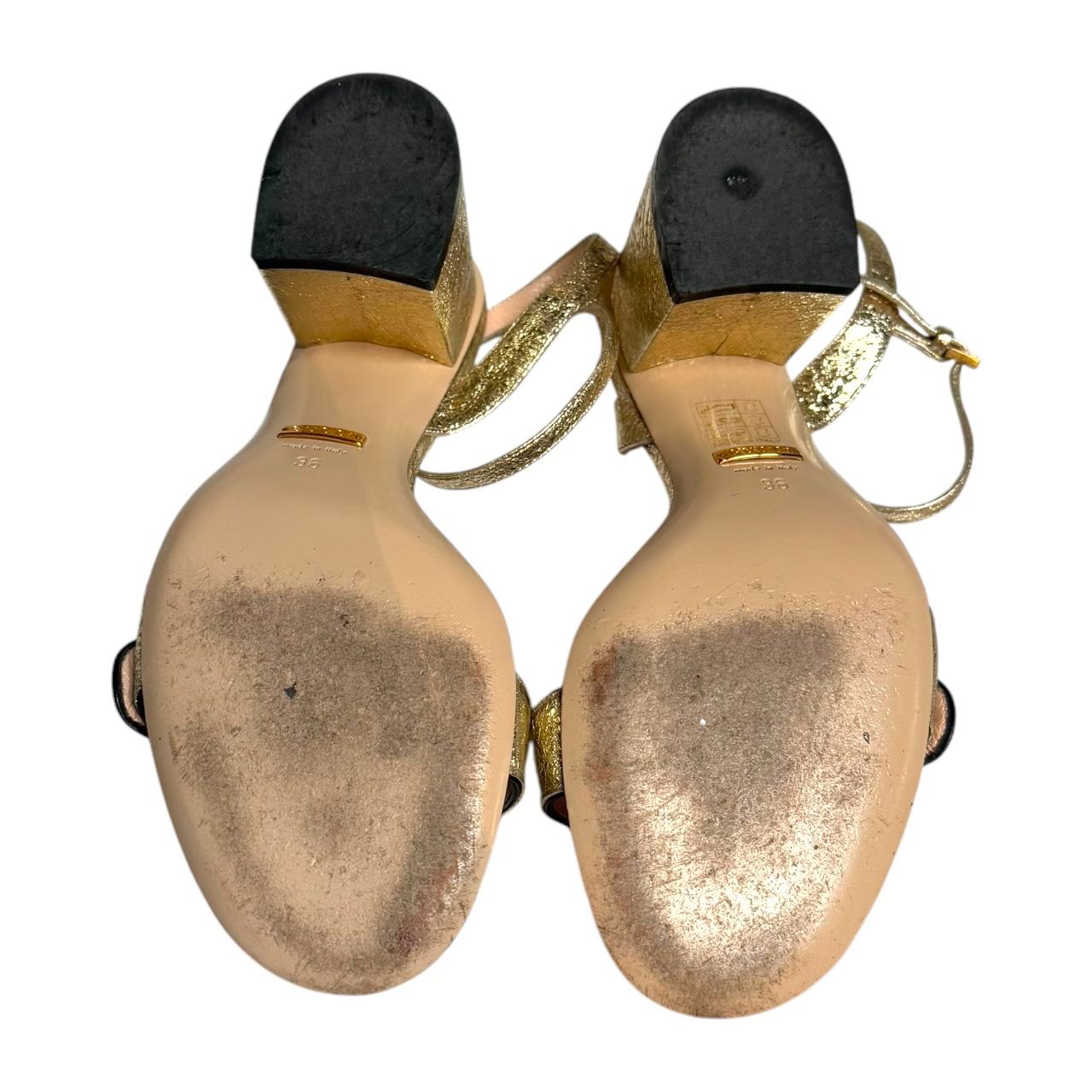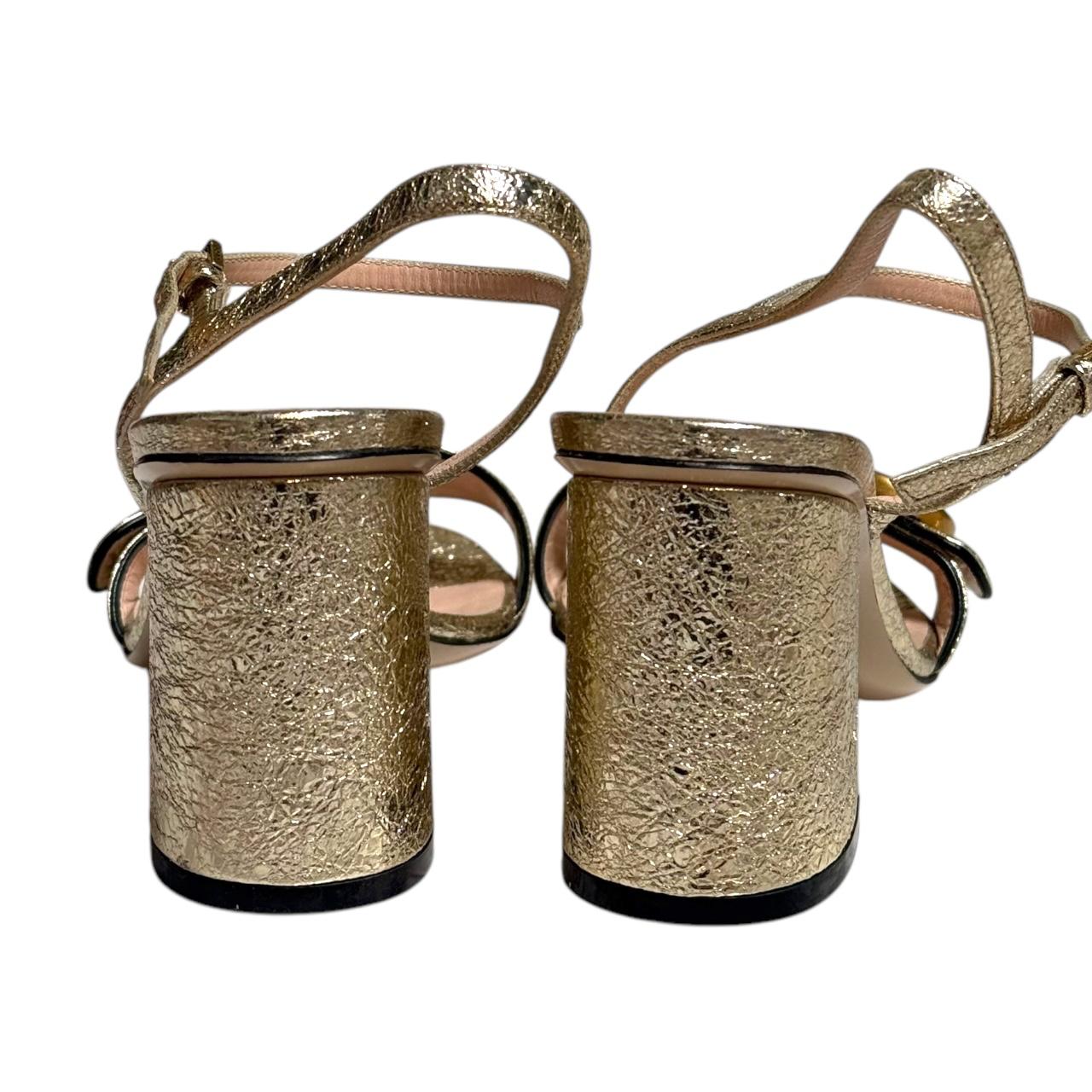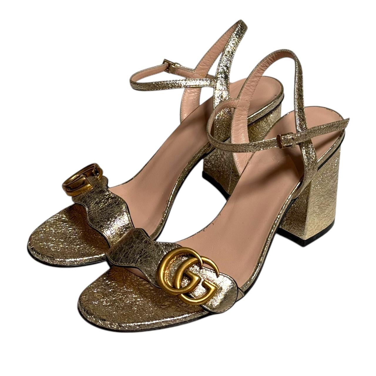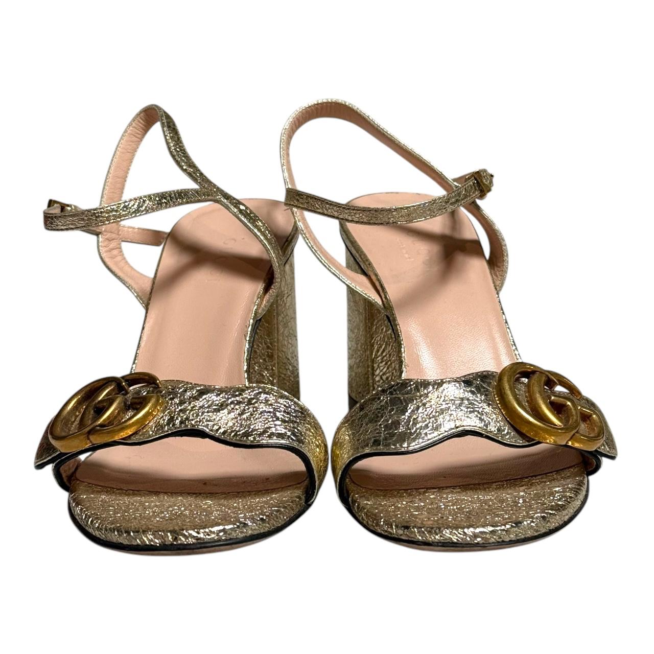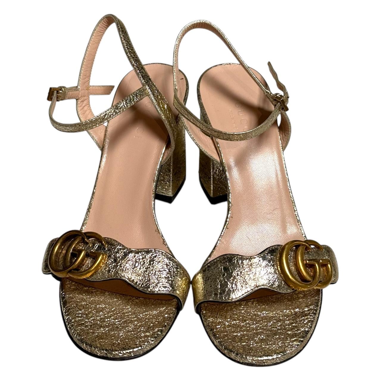 The Gucci Metallic Laminate Leather Mid Heel Sandal Double G features a stylish metallic leather upper with a subtle shine, complemented by the iconic Double G hardware across the strap. The mid-heel design offers a comfortable yet elevated look, making it perfect for both day and evening wear. With its elegant, contemporary aesthetic, this sandal exudes luxury and sophistication.