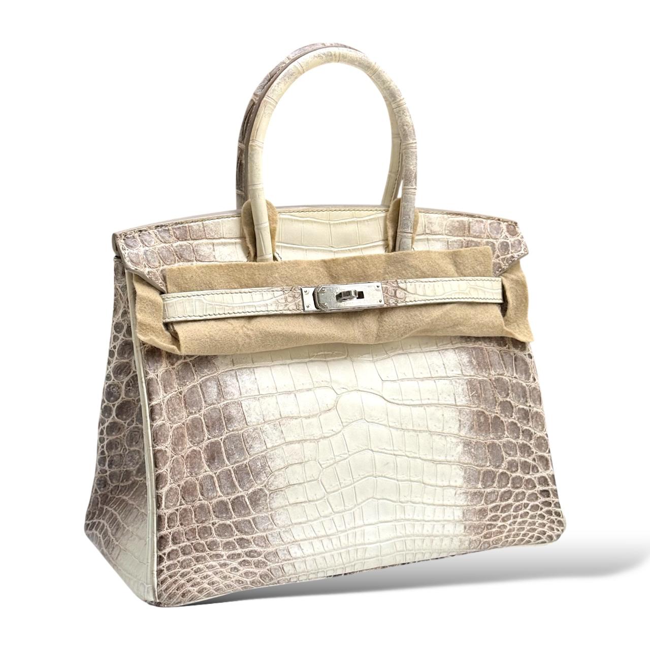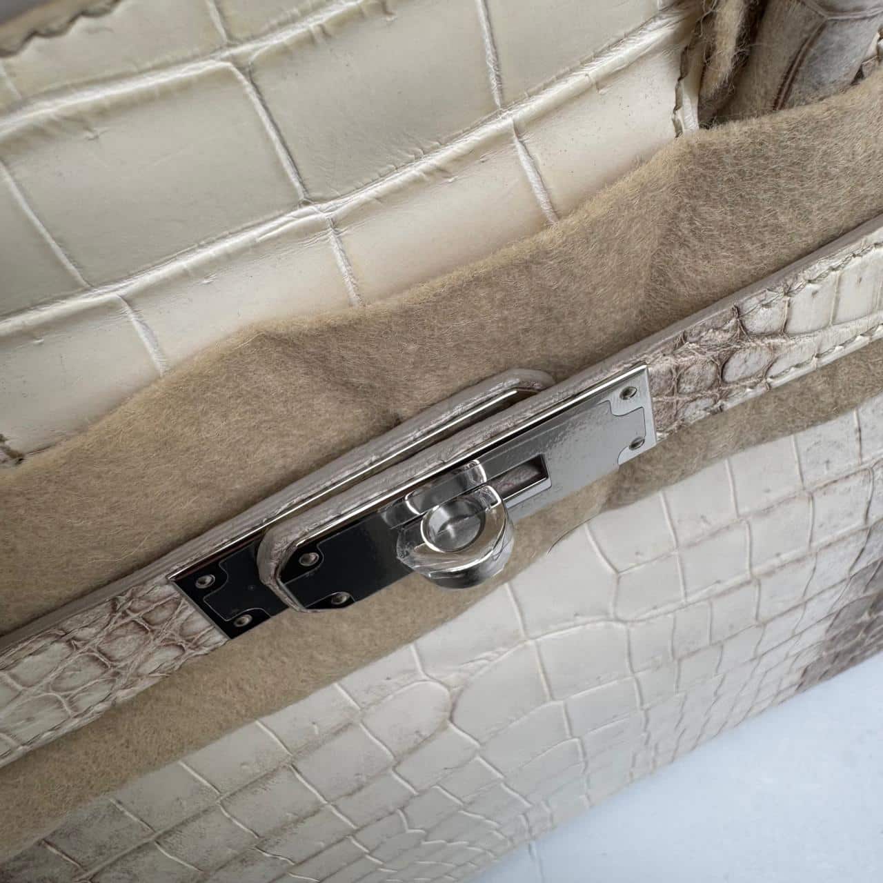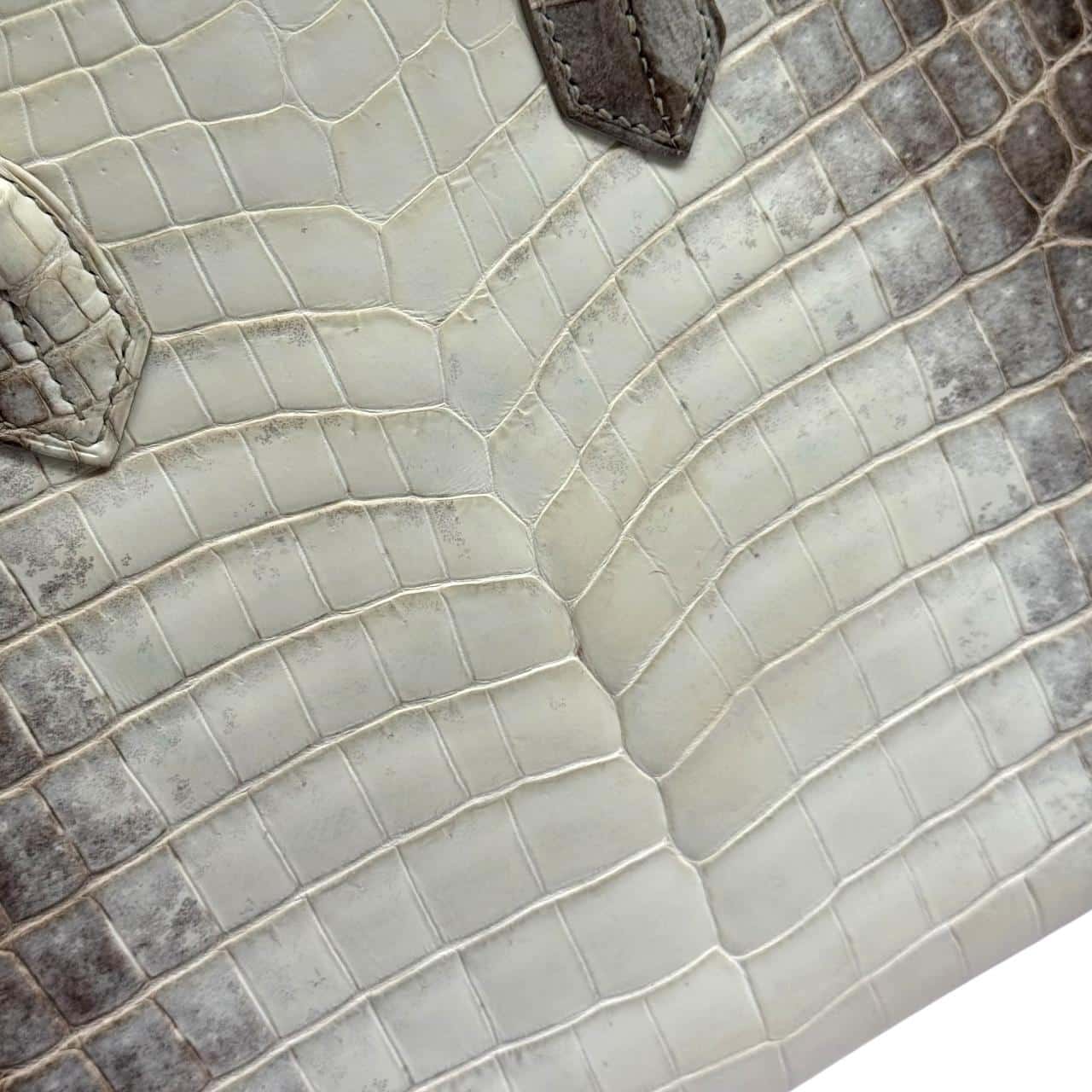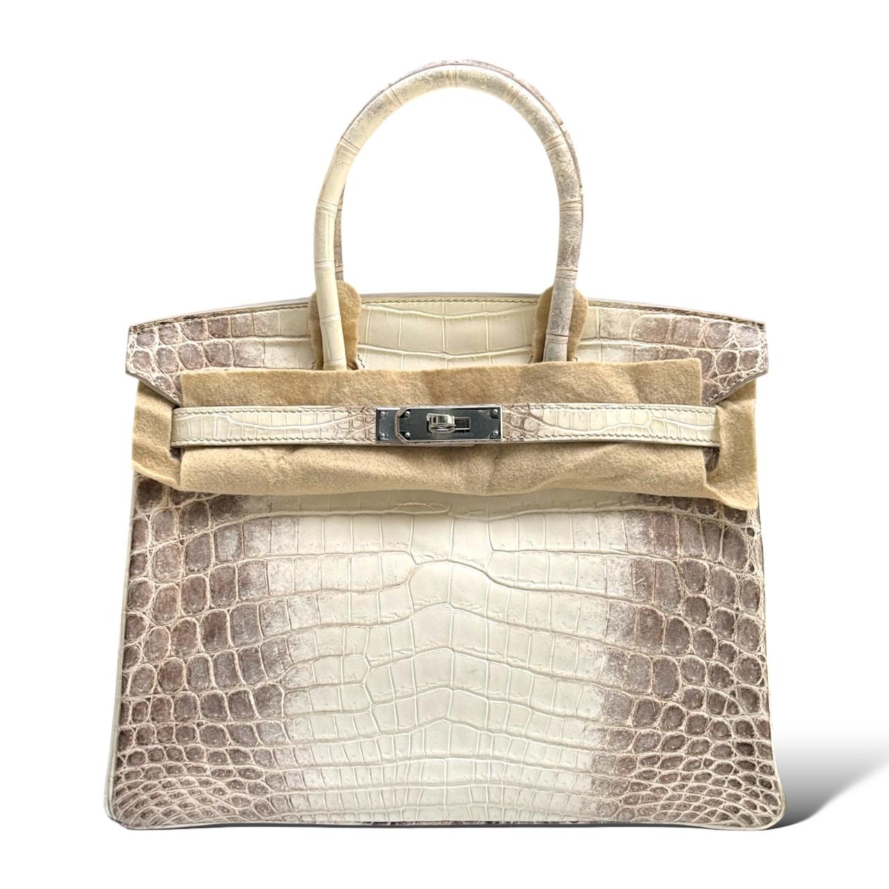The Hermès Birkin 30 Himalaya PHW is one of the most coveted luxury handbags in the world. Crafted from rare Nile crocodile skin, it features a stunning gradient that fades from smoky gray to pearly white, resembling the Himalayan mountains. The “30” denotes its 30 cm size, and “PHW” stands for Palladium Hardware, adding a sleek silver-toned finish to this ultra-exclusive piece.