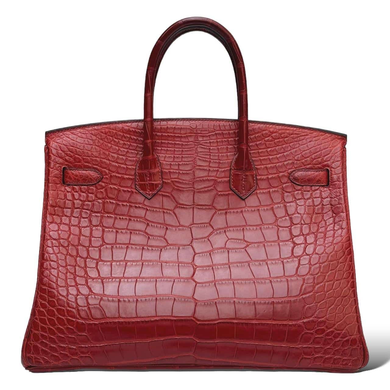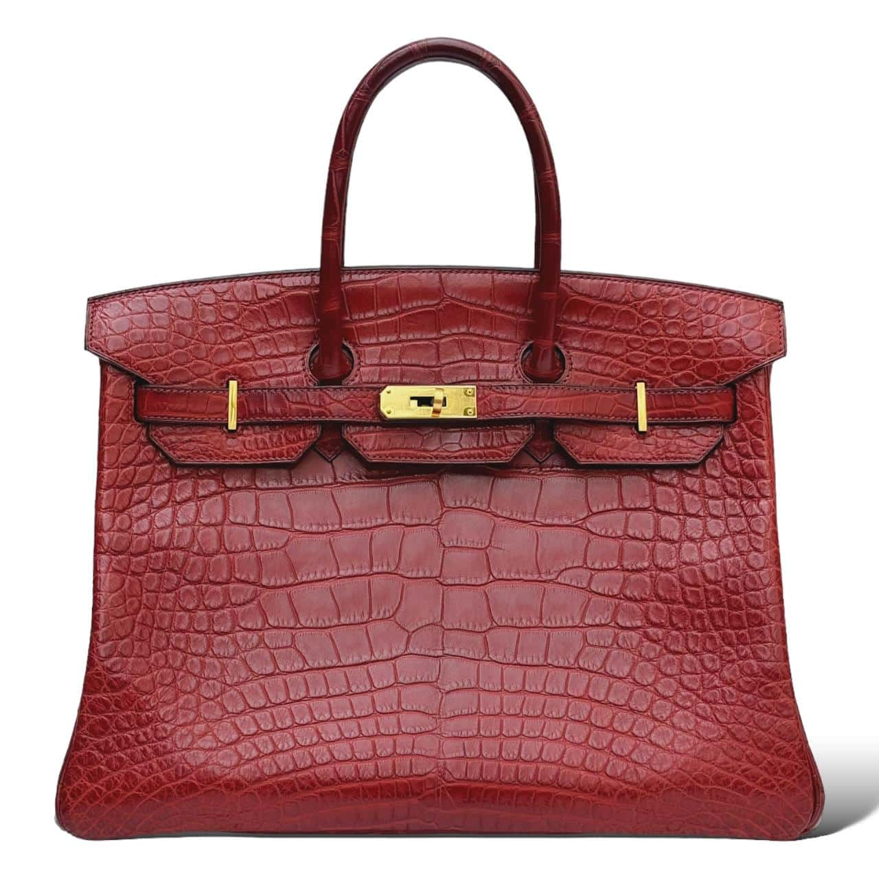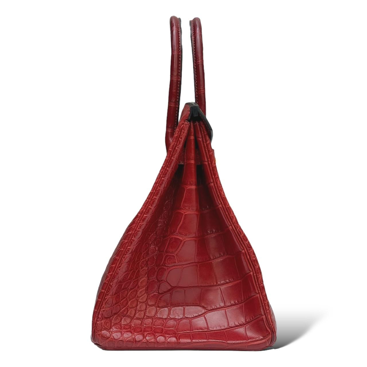 The Hermes Birkin 35 in Bordeaux Crocodile leather with Gold Hardware (GHW) is a symbol of timeless luxury and craftsmanship. The rich Rouge color complements the exotic crocodile leather, showcasing Hermes’ dedication to quality and sophistication. The iconic Birkin silhouette features rolled leather top handles, a flap closure secured by a turn-lock clasp, and gold-plated hardware that adds a touch of opulence.