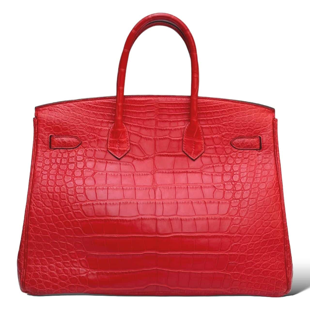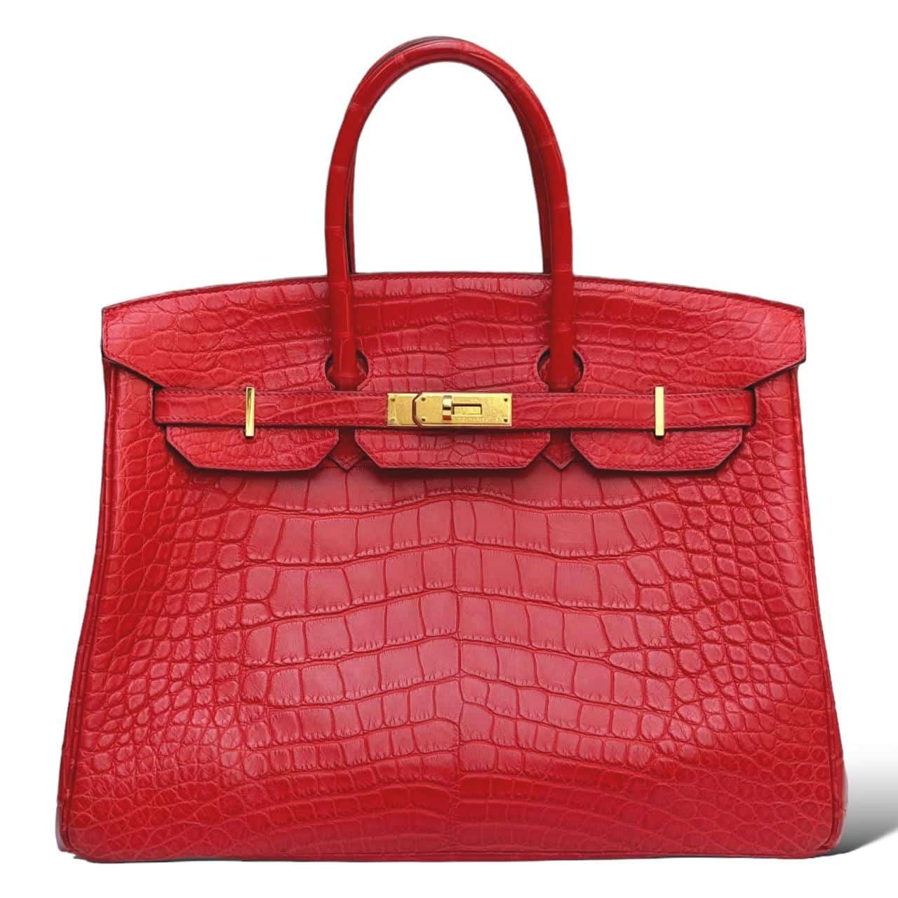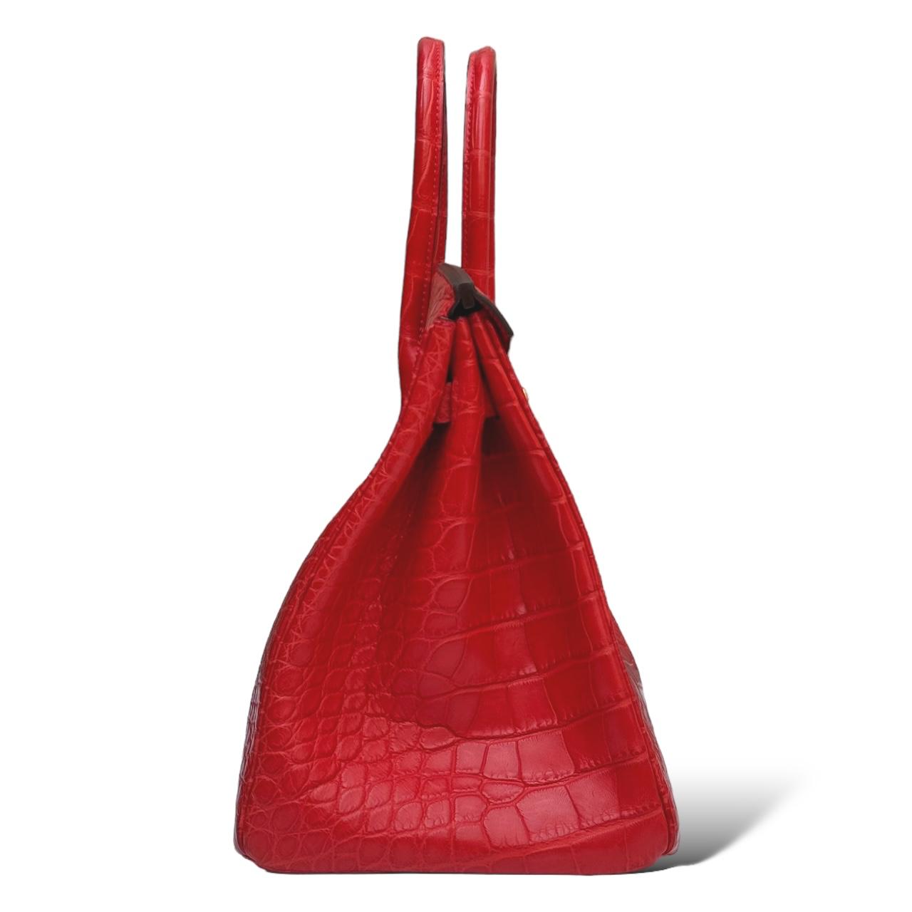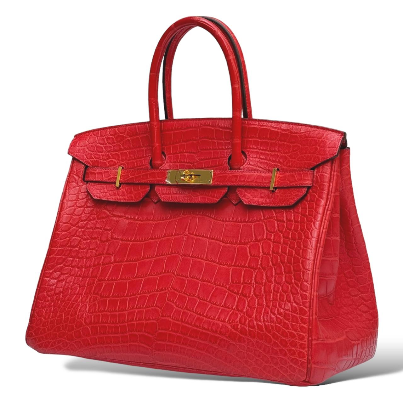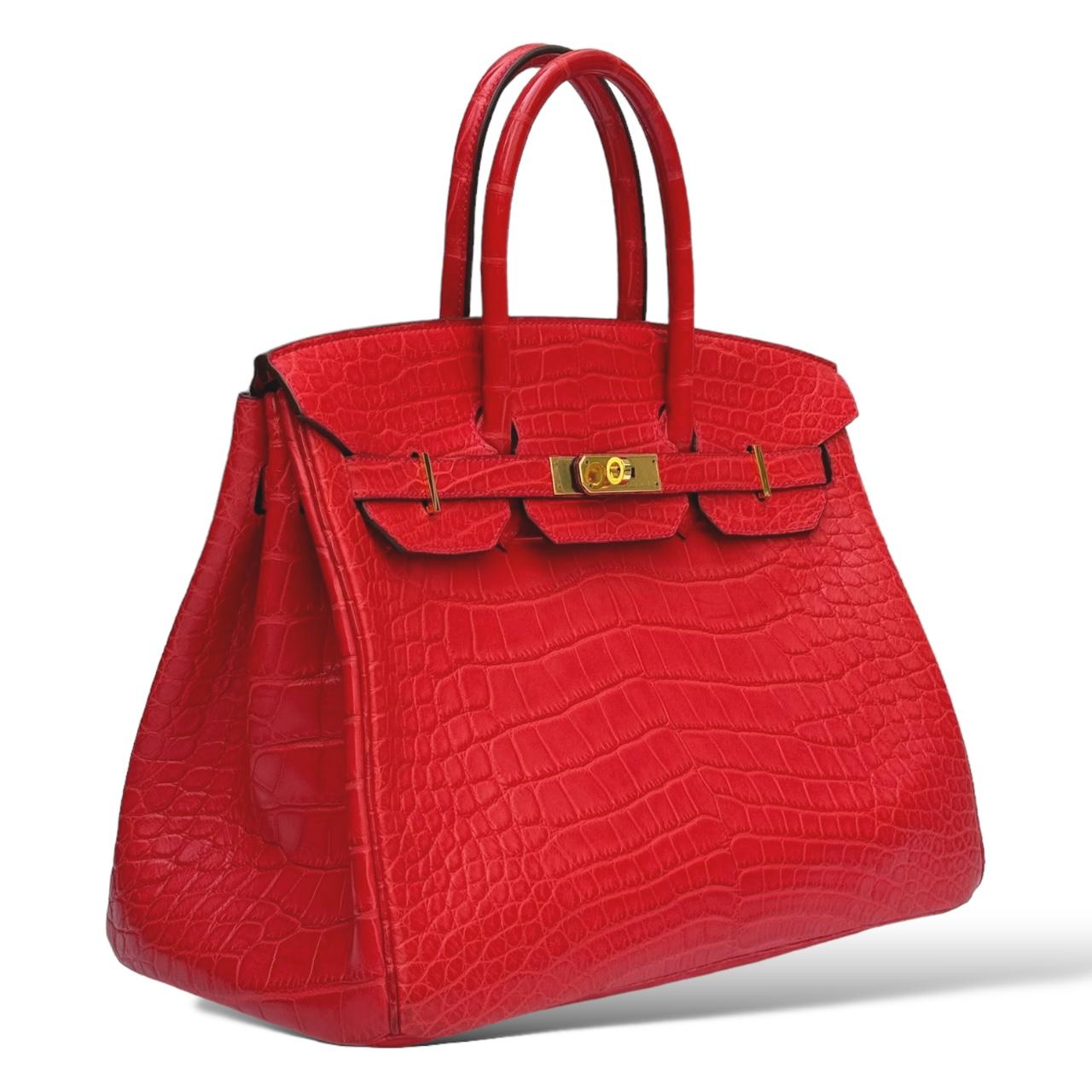 he Hermes Birkin 35 in Rouge Crocodile leather with Gold Hardware (GHW) is a symbol of timeless luxury and craftsmanship. The rich Rouge color complements the exotic crocodile leather, showcasing Hermes’ dedication to quality and sophistication. The iconic Birkin silhouette features rolled leather top handles, a flap closure secured by a turn-lock clasp, and gold-plated hardware that adds a touch of opulence.