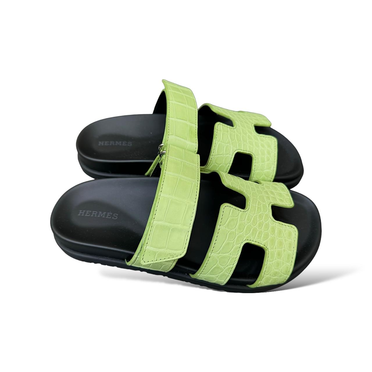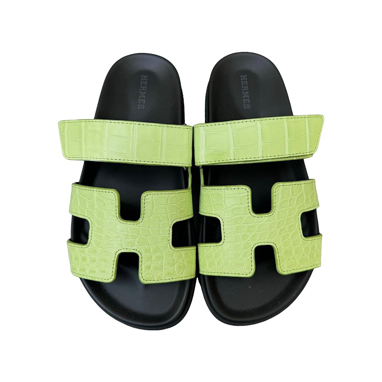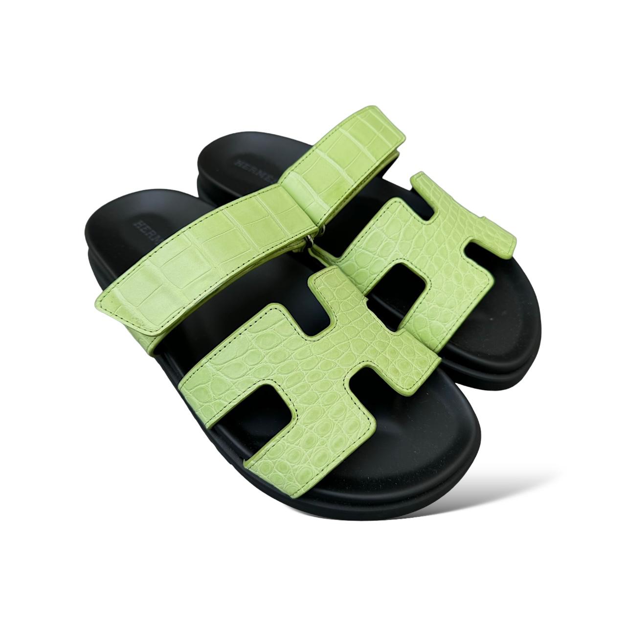 The Hermès Chypre Jaune Bourgeon Crocodile Sandals are a vibrant and luxurious addition to your footwear collection. Crafted from exquisite Jaune Bourgeon crocodile leather, these sandals offer a striking combination of bold color and sophisticated design. The bright yellow hue brings a lively and contemporary touch, perfect for making a fashion statement.