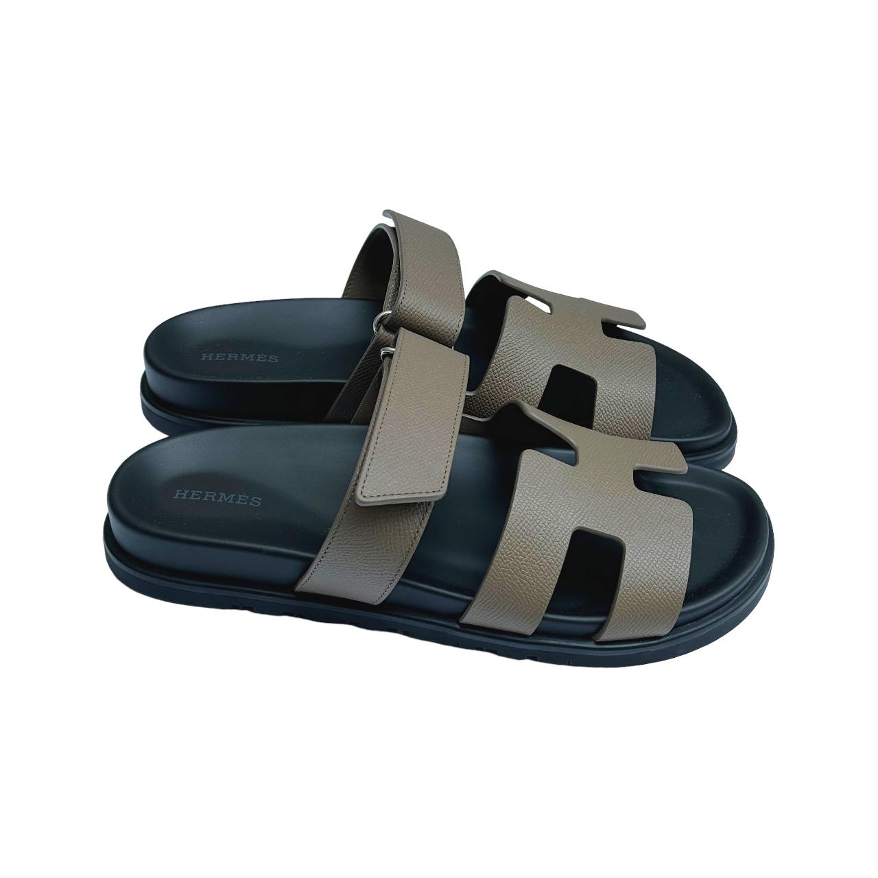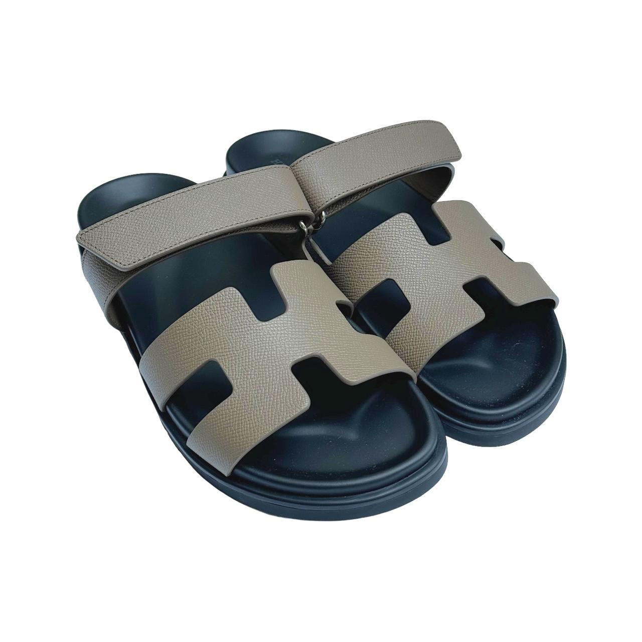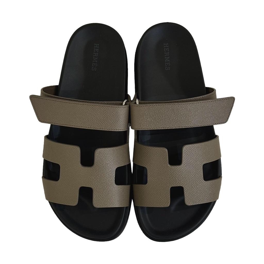 The Hermes Chypre Etoupe sandal is an elegant footwear piece crafted by Hermes. It likely embodies sophistication and style, featuring a design inspired by the Chypre fragrance family. Etoupe, a classic Hermes color, likely adorns these sandals, offering a timeless and chic appearance perfect for various occasions.