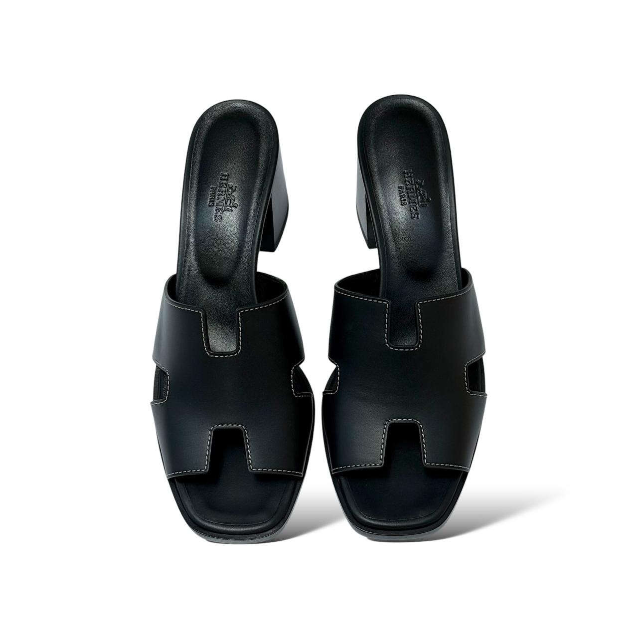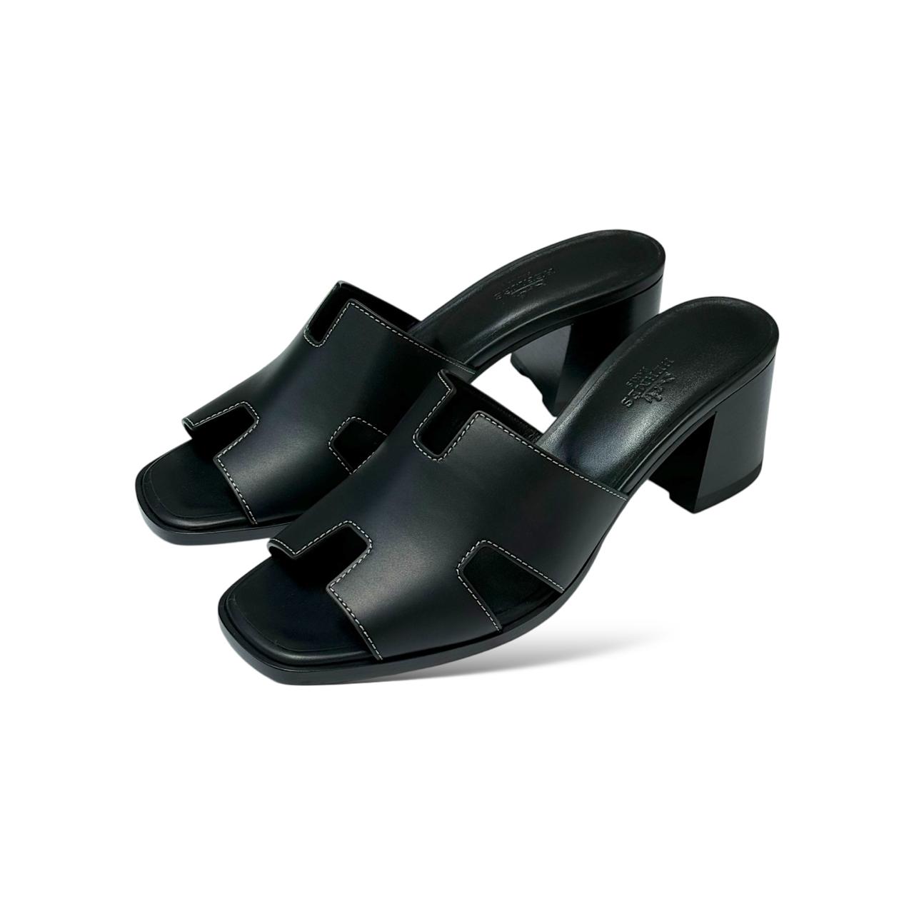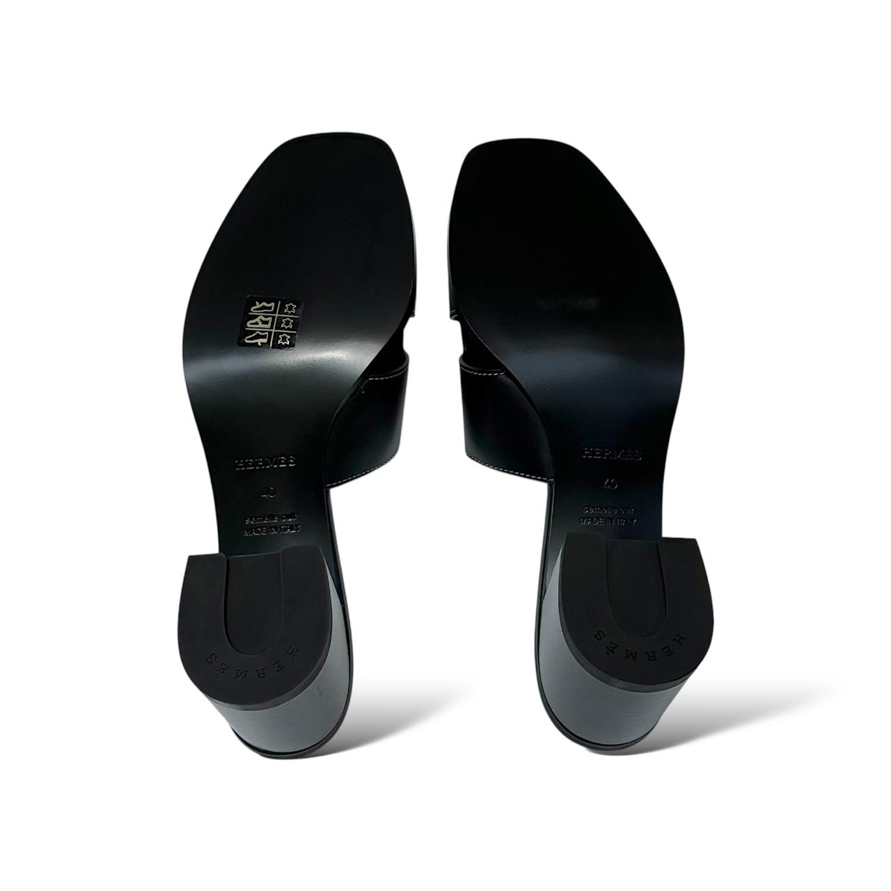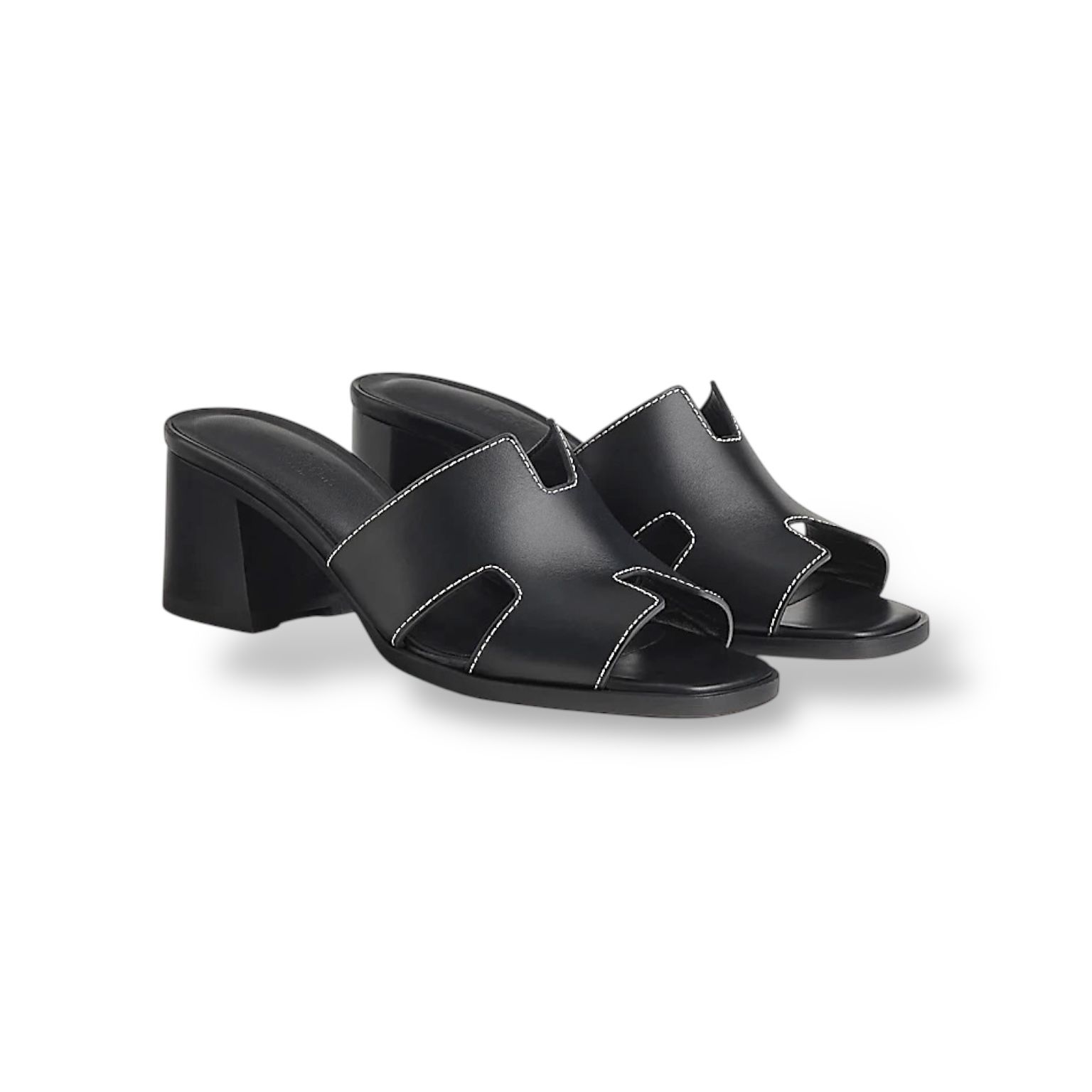 The Hermès Helia 60 Sandal in Black is a refined and contemporary heeled sandal. Crafted from smooth calfskin leather, it features an open-toe design with a distinctive cut-out “H” motif, a signature of Hermès. The sandal is set on a 6 cm block heel, providing both elegance and comfort. Its minimalist aesthetic and neutral black color make it versatile for various occasions