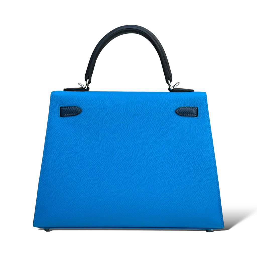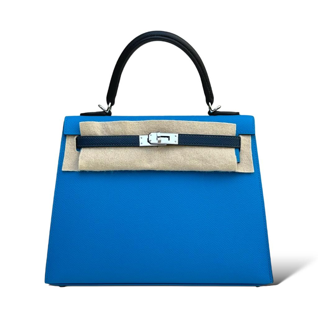 Indulge in timeless elegance with the Hermes Kelly 25 in a captivating combination of Bleu Zanzibar, Bleu de Prusse, and Black, complemented by palladium hardware. This exquisite handbag is a masterpiece of craftsmanship and sophistication, meticulously crafted to perfection. The vibrant hues blend seamlessly, creating a mesmerizing visual appeal that captivates at first glance.