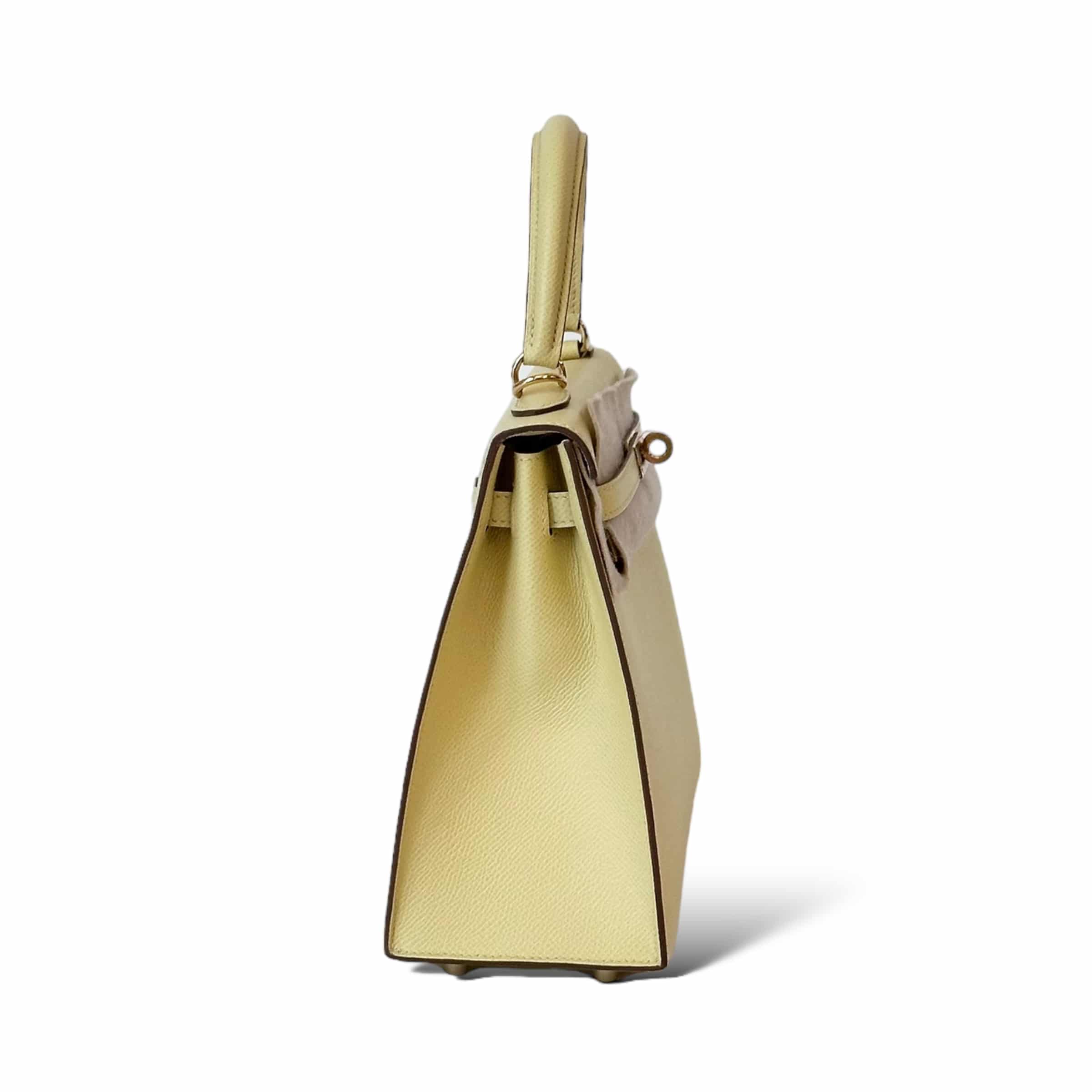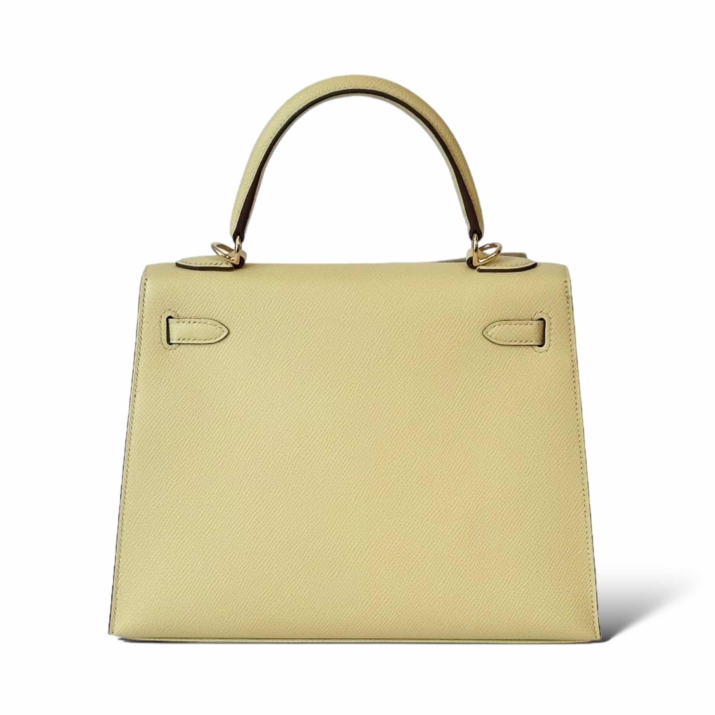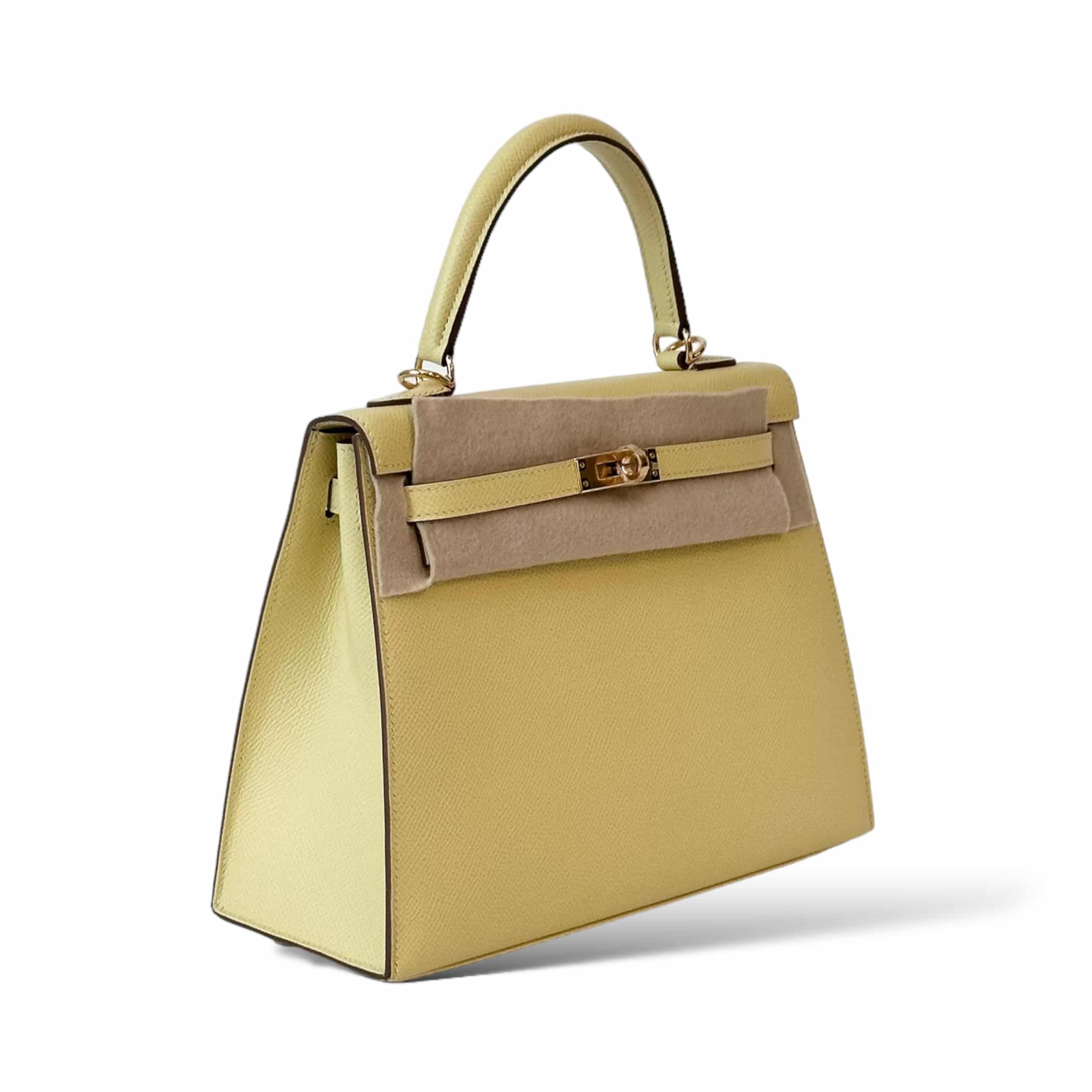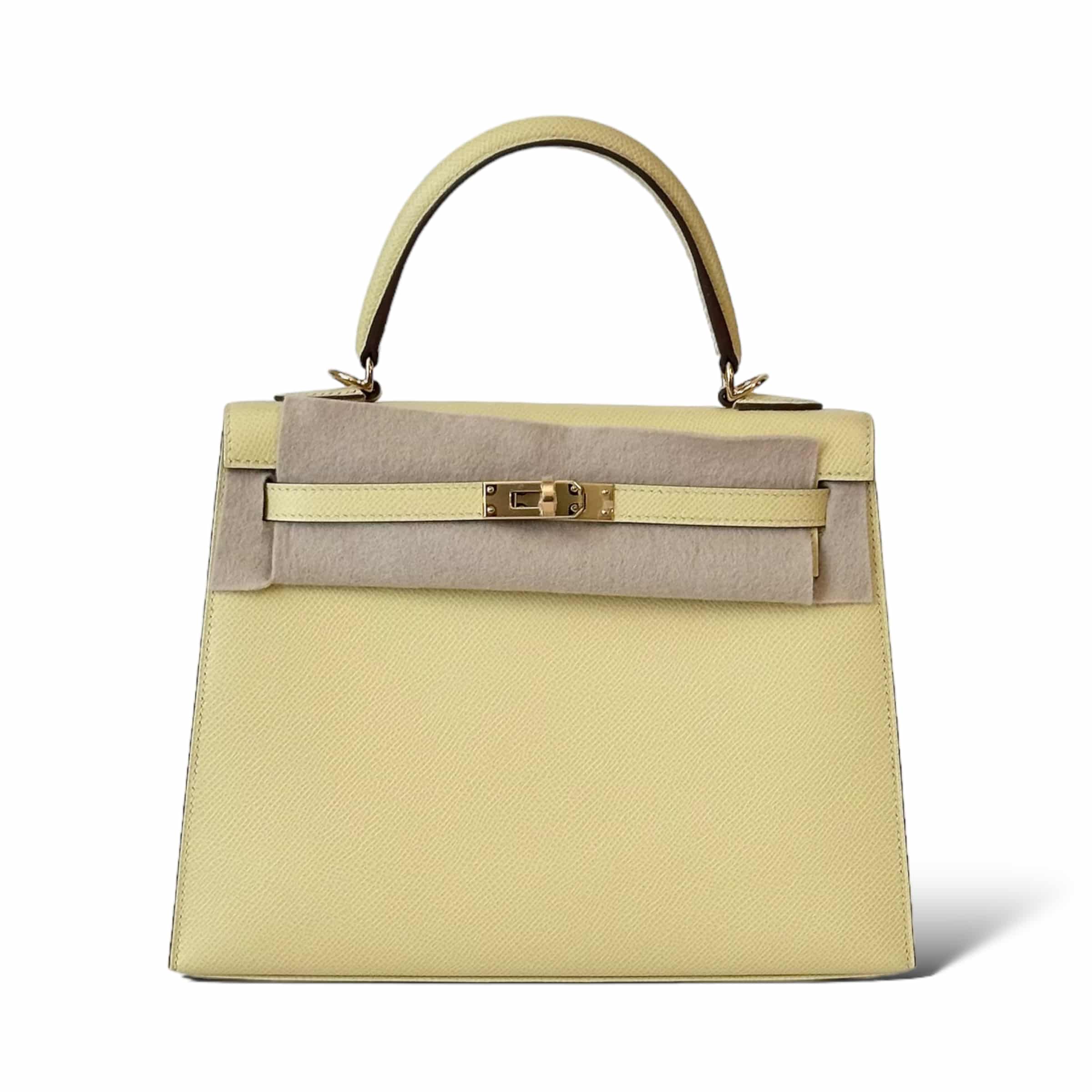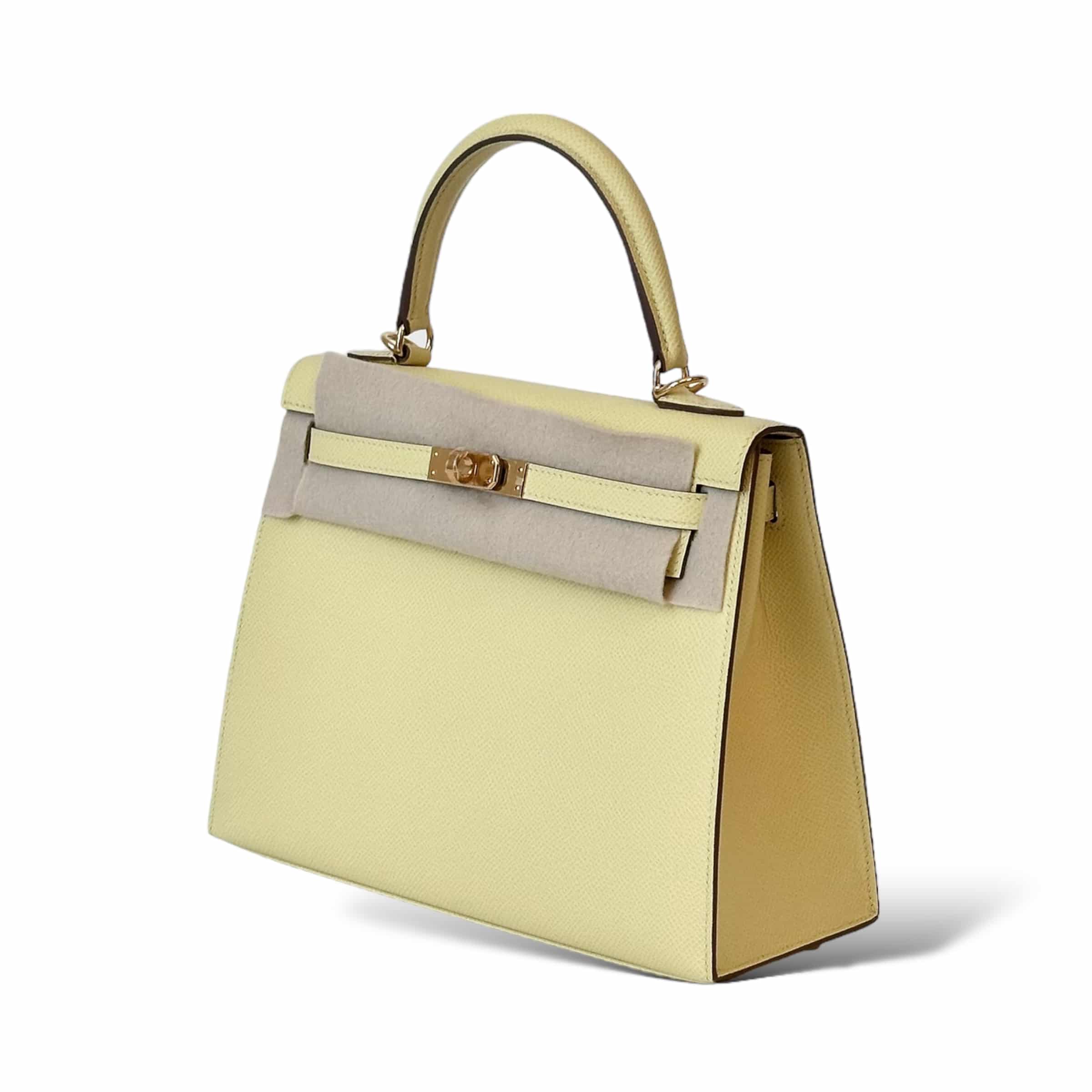The Kelly 25, renowned for its iconic silhouette, exudes an air of sophistication and grace. Crafted meticulously from Epsom leather, the Jaune Poussin shade enchants with its delicate yellow tones, evoking a sense of femininity and allure.
