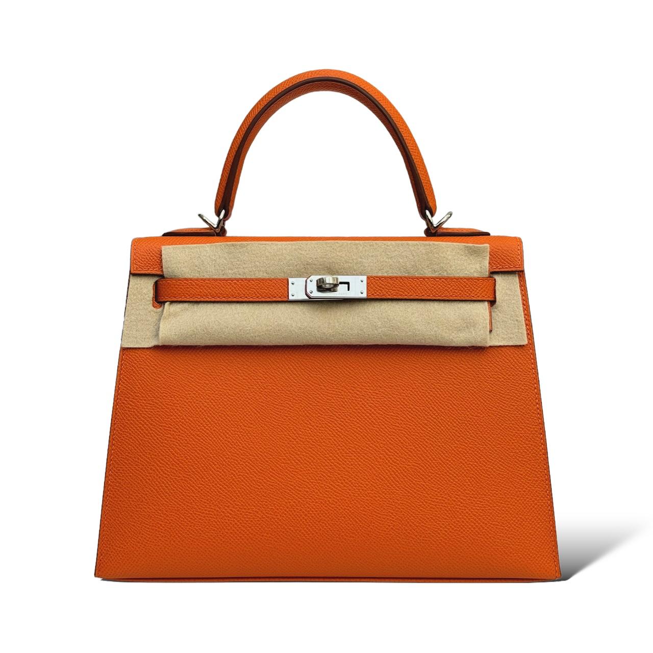 The Hermès Kelly 25 in Orange Epsom with Palladium Hardware (PHW) is a vibrant and elegant handbag that embodies timeless luxury. Crafted from durable Epsom leather in a striking Orange hue, this bag stands out with its bold color and impeccable craftsmanship. The Palladium hardware adds a sleek, modern touch, perfectly complementing the vivid leather.