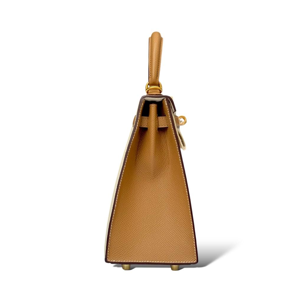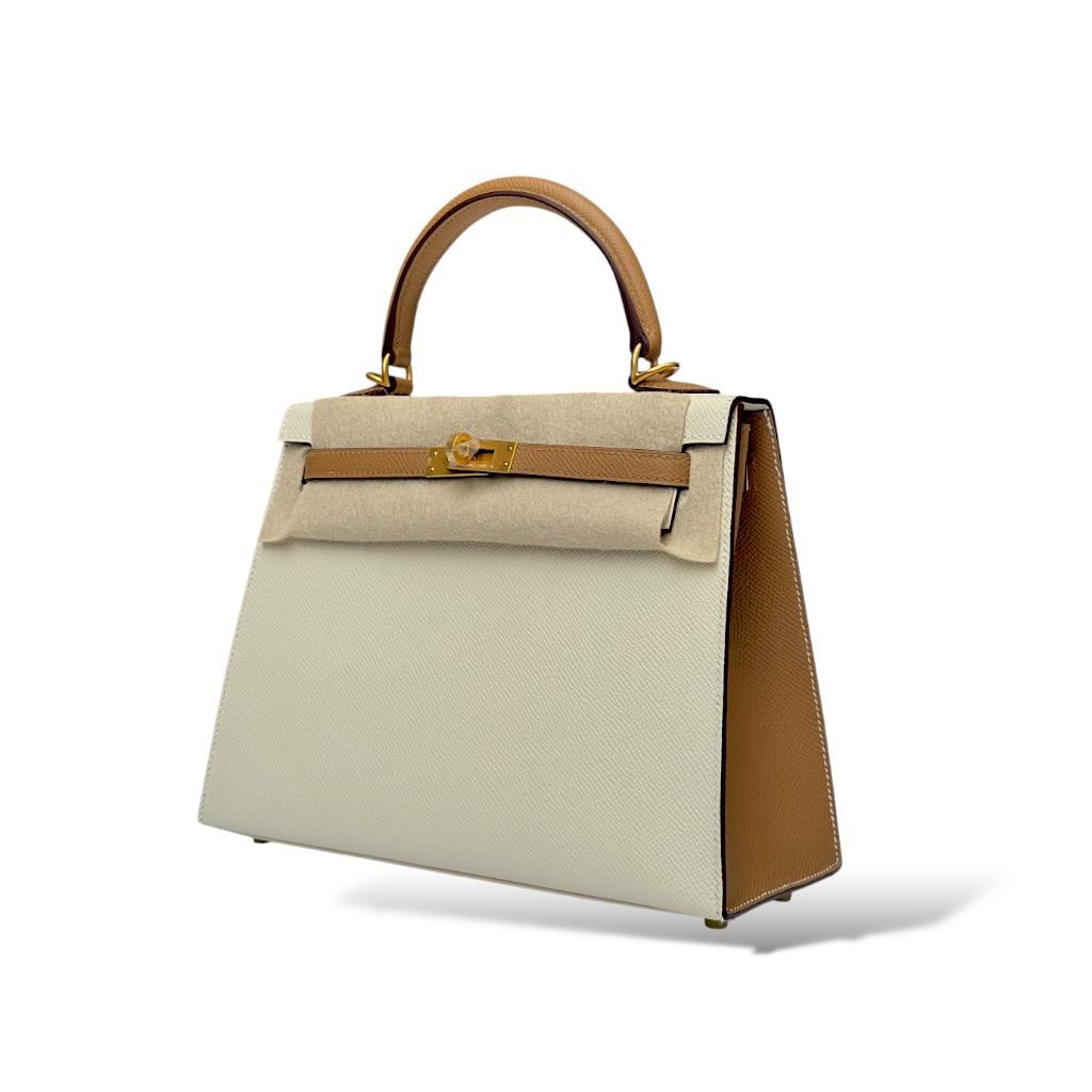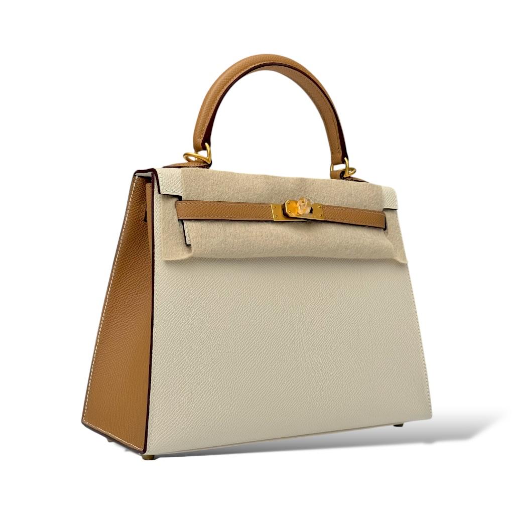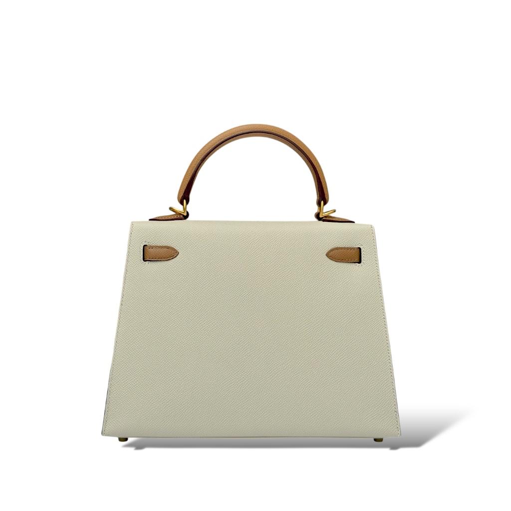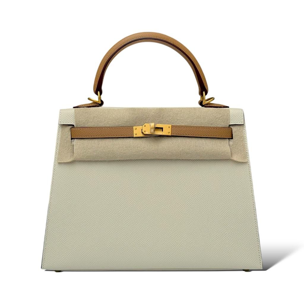 This Hermès Kelly 25 Special Order (SO) features an exquisite combination of Craie and Biscuit in durable Epsom leather. The soft Craie hue complements the warm tones of Biscuit, making it a versatile and sophisticated piece. The structured silhouette is accented with Brushed gold hardware (BGHW), adding a modern touch of elegance. Its size makes it perfect for both day and evening use, and the bag showcases the iconic craftsmanship Hermès is known for.