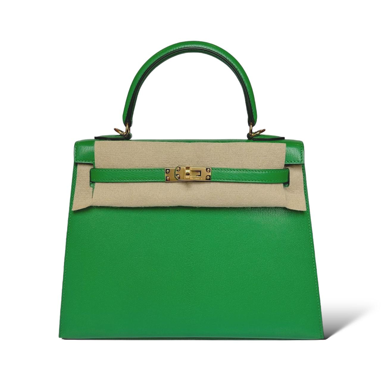 Discover the epitome of luxury and elegance with the Hermes Kelly 25 in Vert Bambou. This stunning bag blends timeless design with a fresh, contemporary hue, making it a standout addition to any collection.