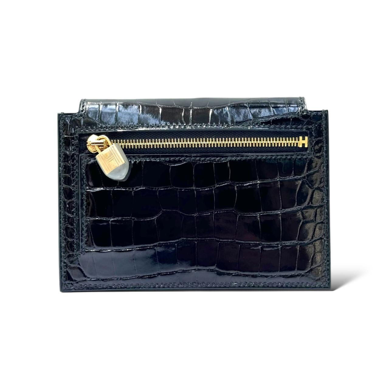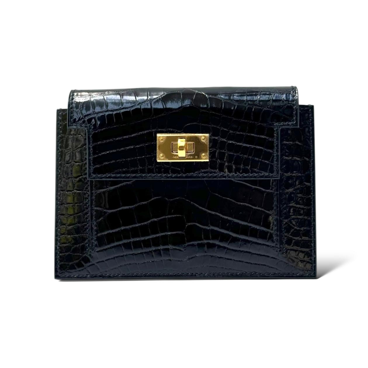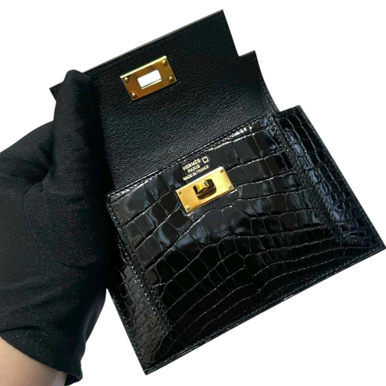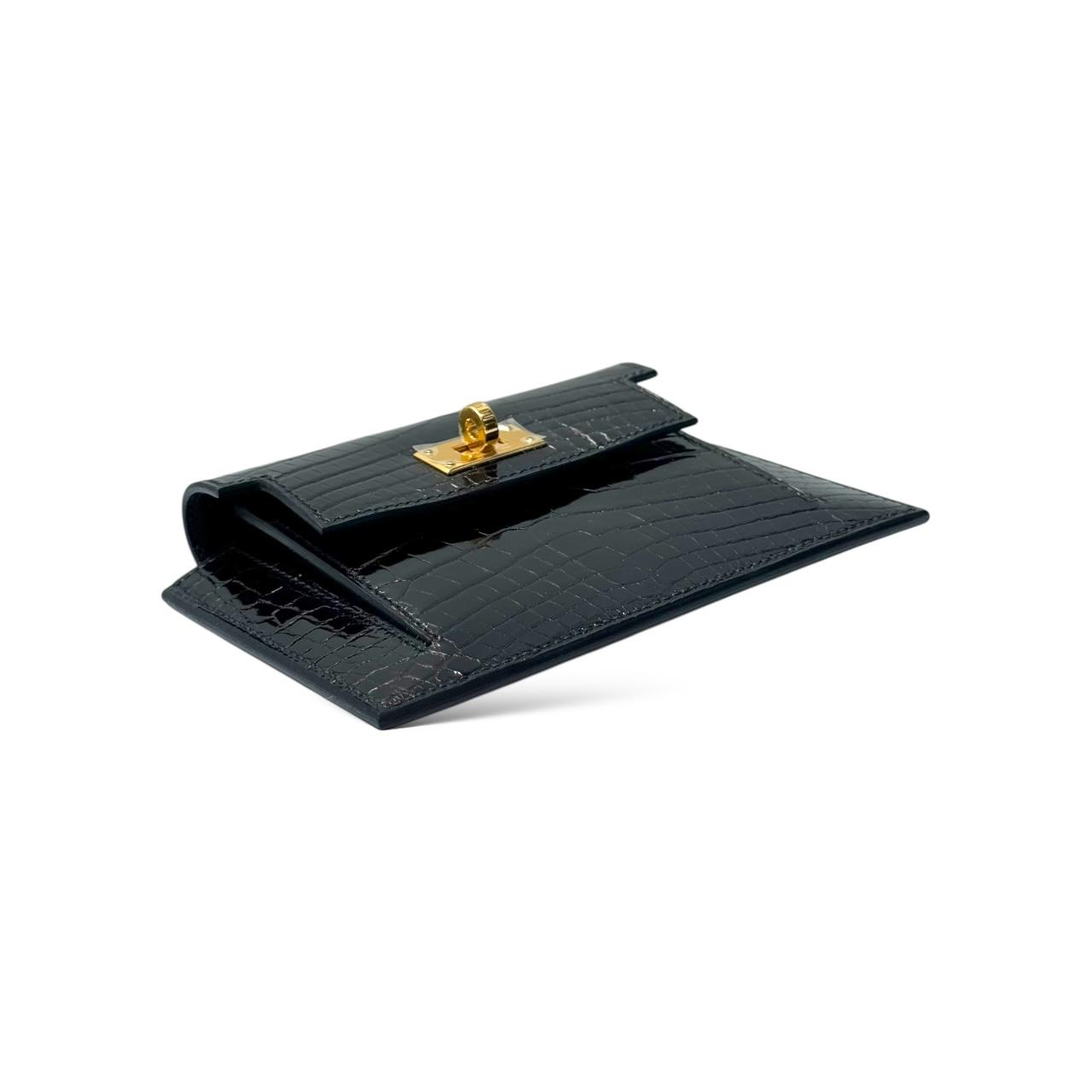 The Hermès Kelly Pocket Compact Wallet in Noir Crocodile leather is a luxurious and elegant accessory, featuring glossy black croc skin and signature gold hardware (GHW). Inspired by the iconic Kelly bag, it includes a front flap with a mini Kelly turn-lock closure, a zip pocket, and multiple card slots—perfect for carrying essentials in style.
