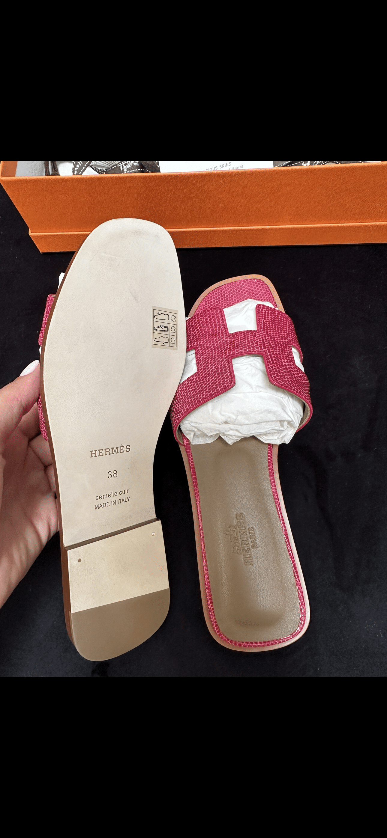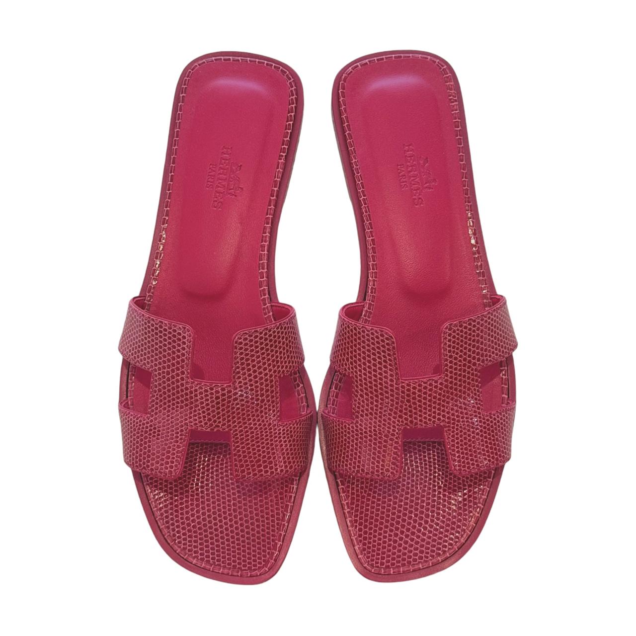 The Hermès Oran sandals are sleek, flat leather sandals featuring a signature “H” cut-out design. Known for their minimalist style and premium craftsmanship, they offer both comfort and timeless elegance.