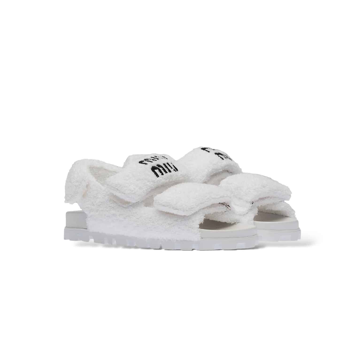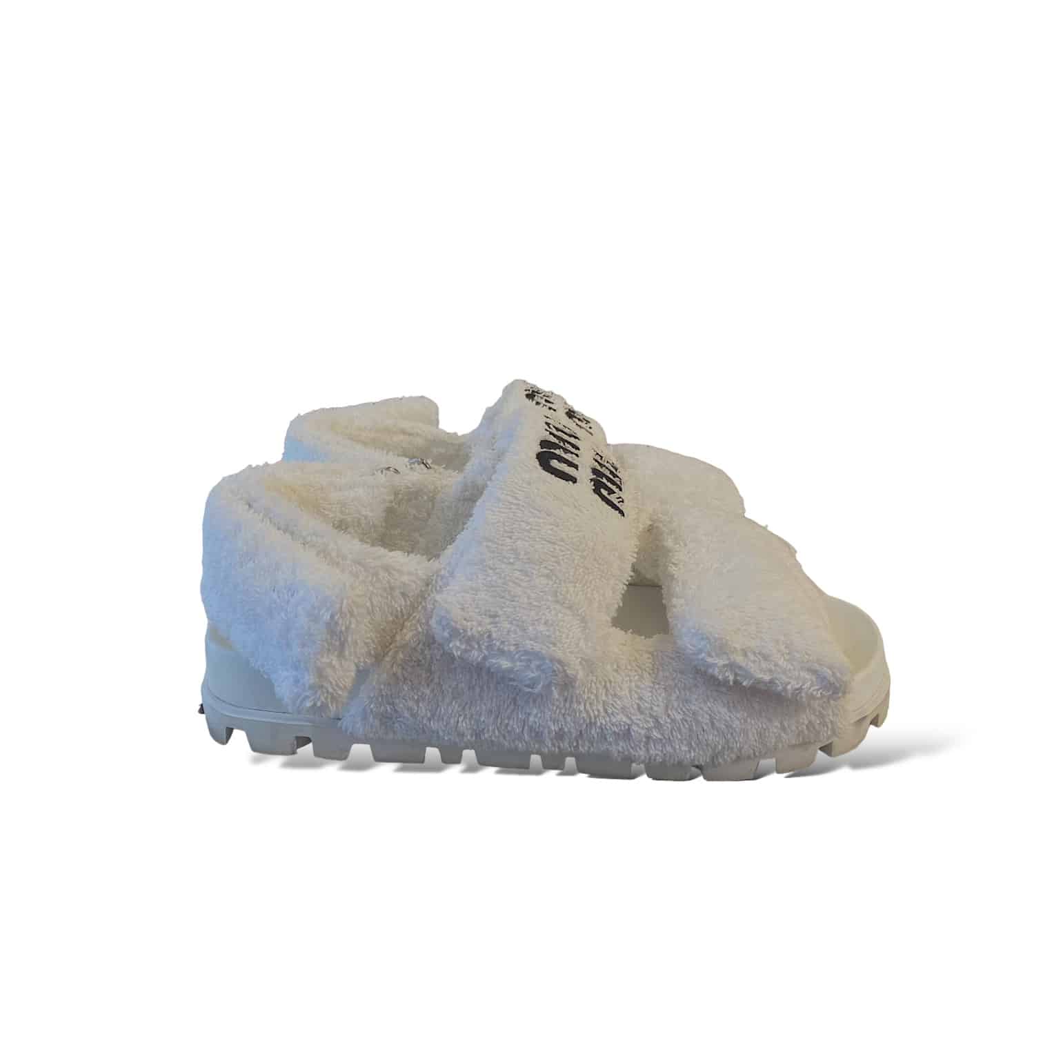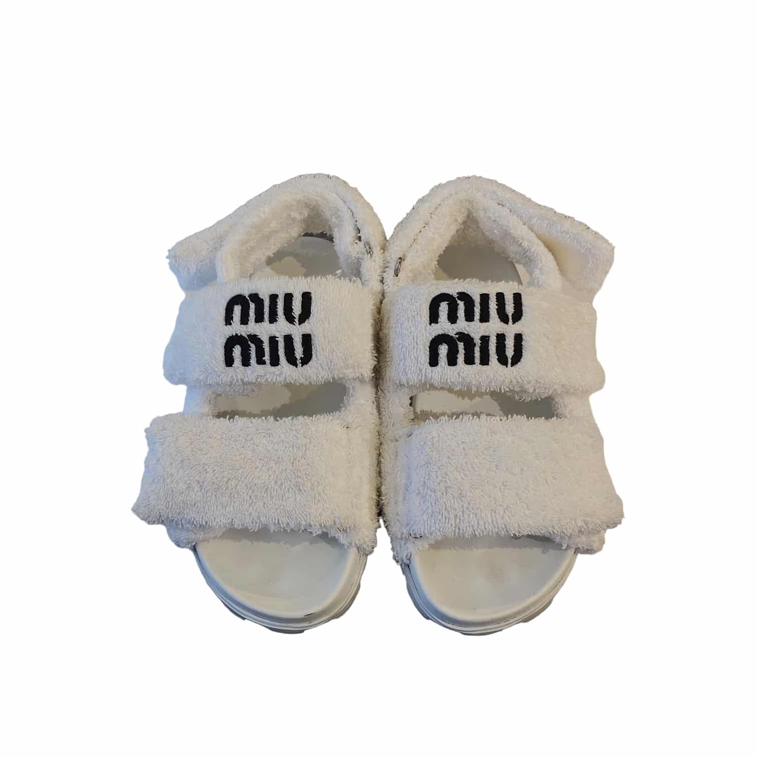 The Miu Miu Terry White Sandals are chic and contemporary footwear crafted by the renowned Italian fashion house, Miu Miu. These stylish sandals feature a minimalist design with a white terry cloth upper, offering a comfortable and relaxed look. The sandals are adorned with Miu Miu’s signature logo on the straps, adding a subtle touch of luxury. With their versatile and casual design, the Miu Miu Terry White Sandals are a perfect choice for adding a fashionable yet laid-back vibe to your summer wardrobe.