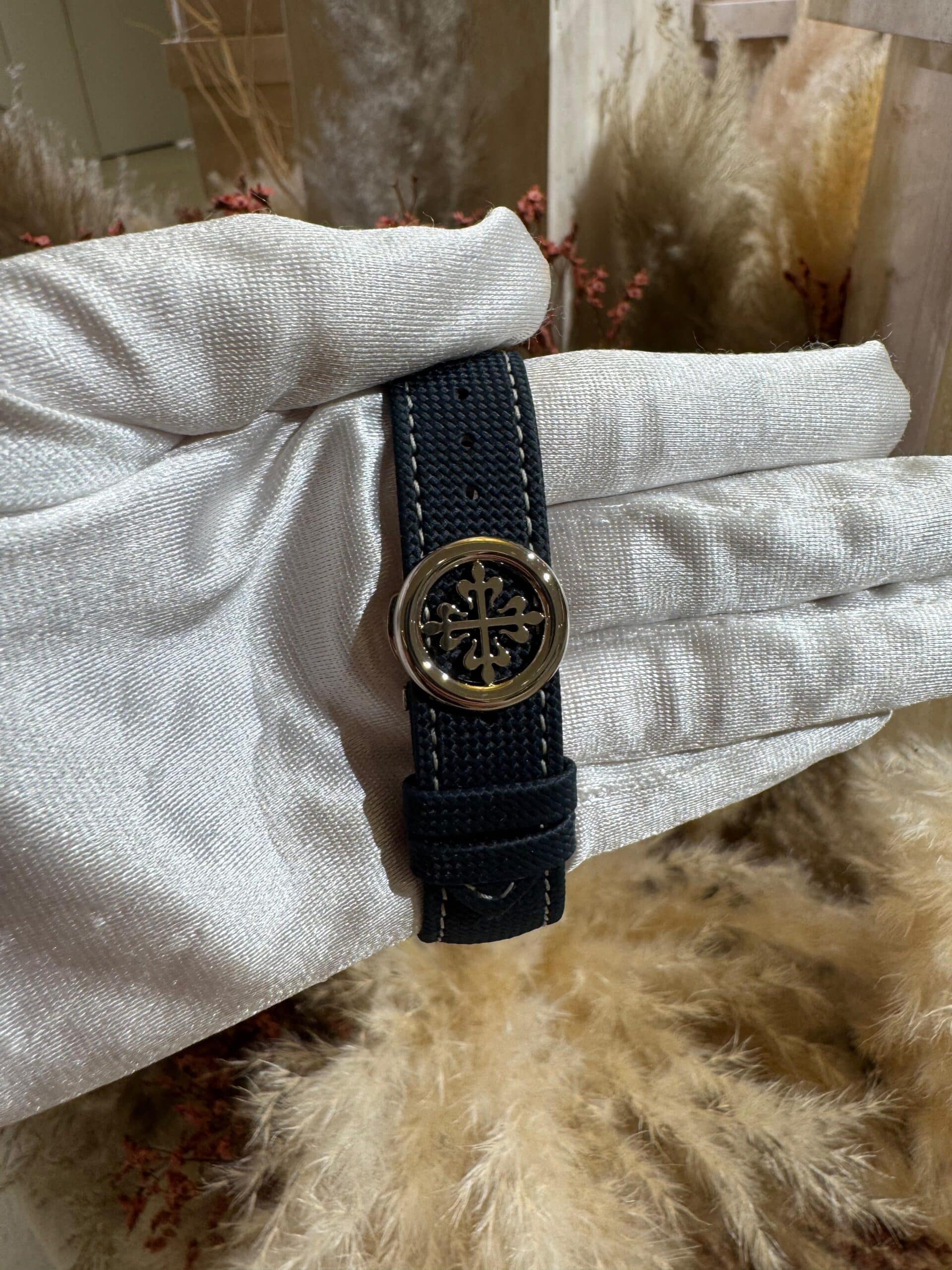 The Patek Philippe 5328G-001 is a 41mm white gold Calatrava featuring a navy-blue textured dial with luminescent Arabic numerals. It houses a manual-wind movement with an 8-day power reserve, instantaneous day and date display, and a power reserve indicator. The case features a Clous de Paris guilloché pattern, and the watch is paired with a navy-blue calfskin strap and an extra taupe strap. Elegant and technically advanced, it blends traditional design with modern horological innovation.