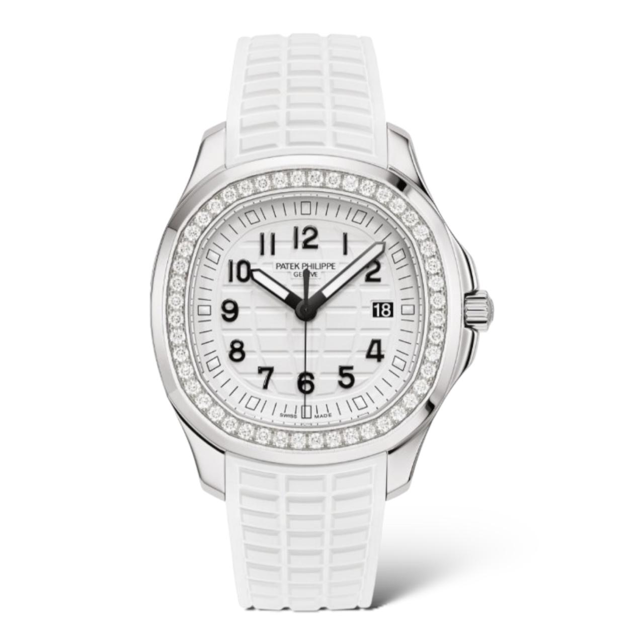 The Patek Philippe Aquanaut Luce is a sophisticated timepiece featuring a 35.2mm stainless steel case adorned with diamonds. Its elegant white dial complements the diamond-set bezel, while the comfortable white composite strap adds a modern touch.