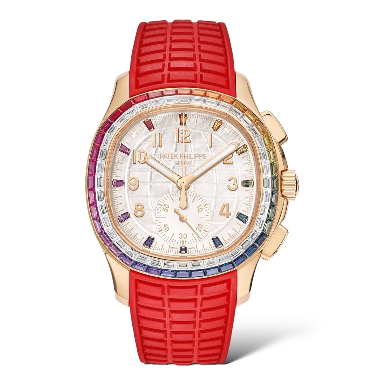 A striking fusion of color and elegance, this 39.9mm rose gold Aquanaut Luce features a bezel set with 40 baguette-cut rainbow sapphires and 10 baguette-cut diamonds, forming a perfect gradient. The white mother-of-pearl dial is paired with rose gold applied numerals and a vibrant red composite strap, with two additional straps in beige and white for added versatility.