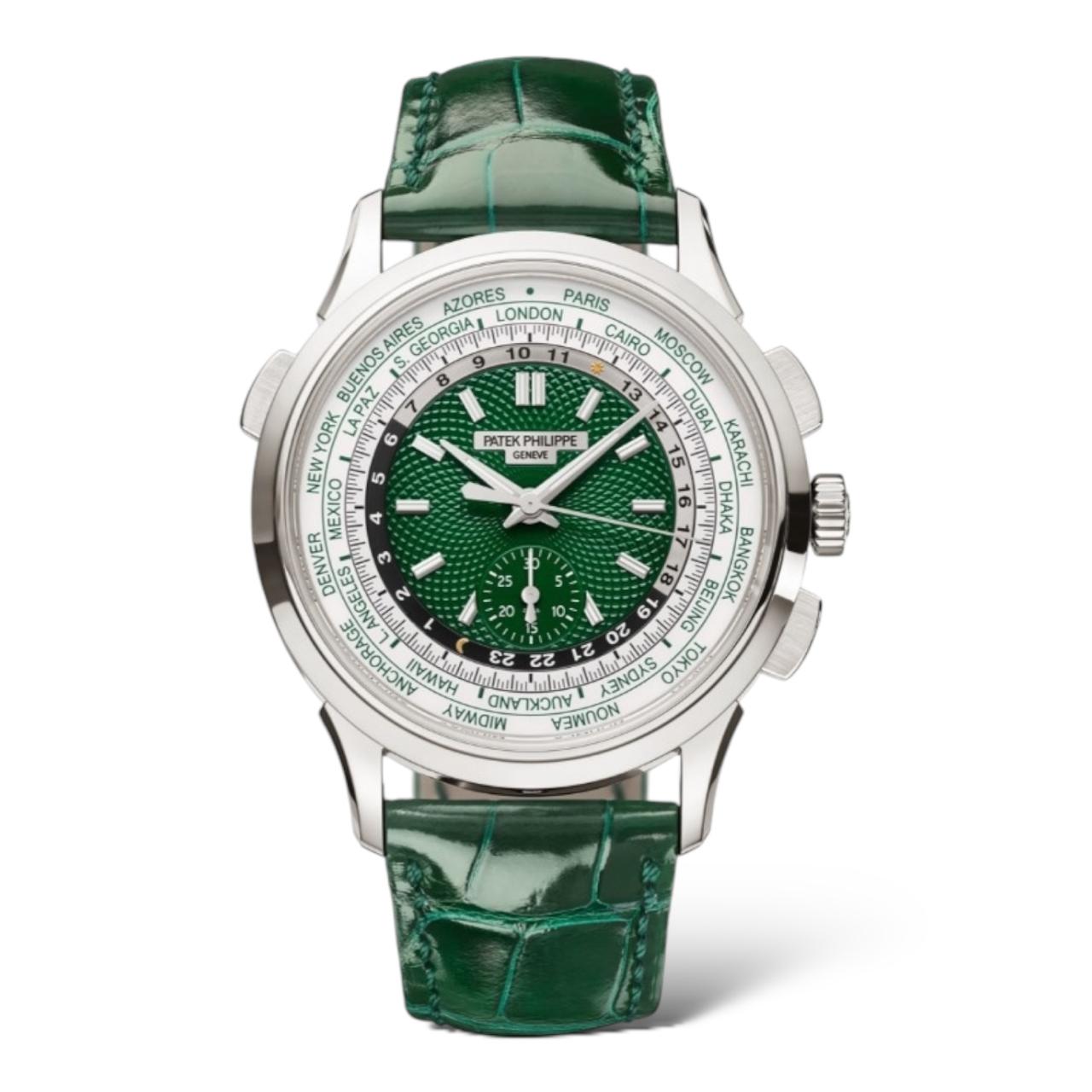 The Patek Philippe Complications 5930P-001 39.5mm Platinum Case Alligator Leather Strap is a masterpiece of horological engineering, combining the precision of a flyback chronograph with the functionality of a world time complication. Its platinum case exudes timeless elegance, while the green dial and strap create a striking contrast.