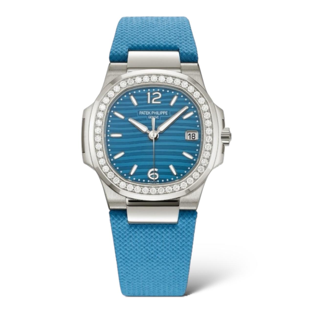The Patek Philippe Nautilus 7010G-013 is a 32mm ladies’ watch in 18k white gold with a diamond-set bezel and a striking azure blue wave-pattern dial. Powered by a quartz movement, it features a date display and comes with a blue composite strap. Elegant yet sporty.