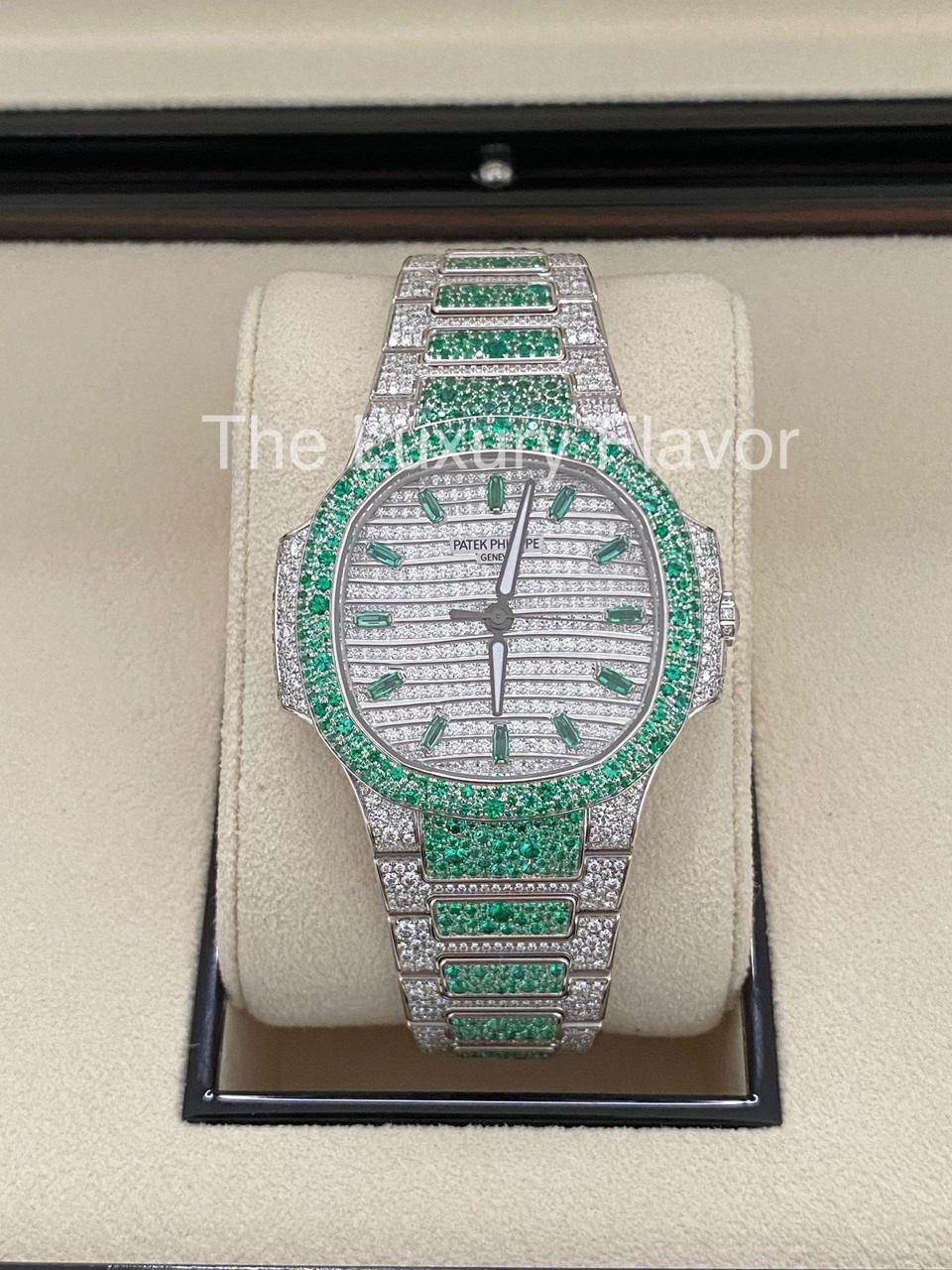 The Patek Philippe Nautilus 35.2mm dazzles with diamonds (6.53 carats) and emeralds. This self-winding masterpiece in 18k white gold features a diamond-paved wave dial and emerald hour markers. Sapphire case back reveals the intricate Caliber 26-330 S movement. Luxury meets sport in this unforgettable timepiece.