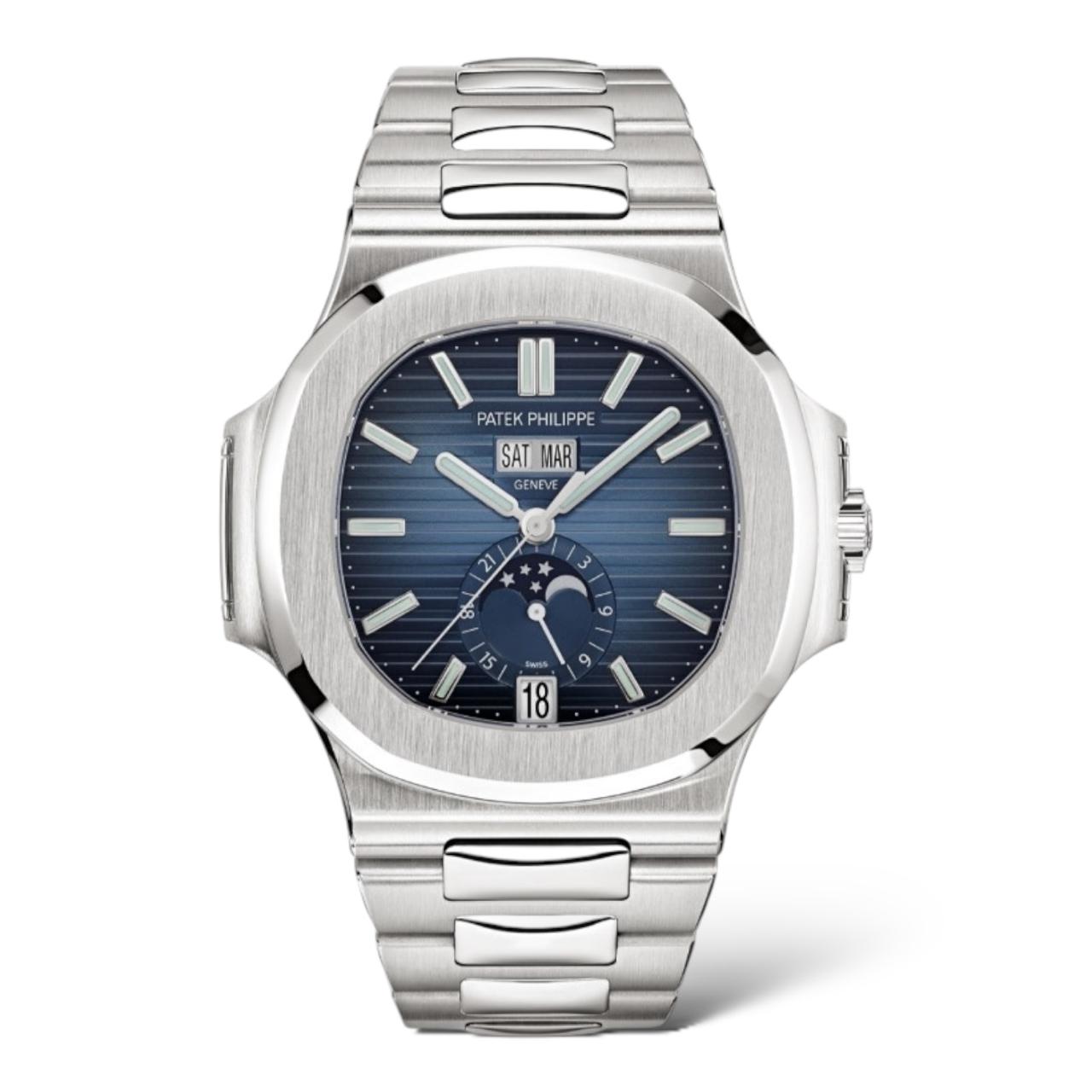 This exceptional timepiece combines the iconic Nautilus design with the practical features of an annual calendar and moon phase display. The 40.5mm stainless steel case features a stunning blue dial, adding a touch of sophistication.