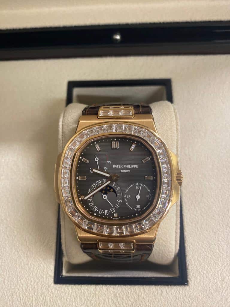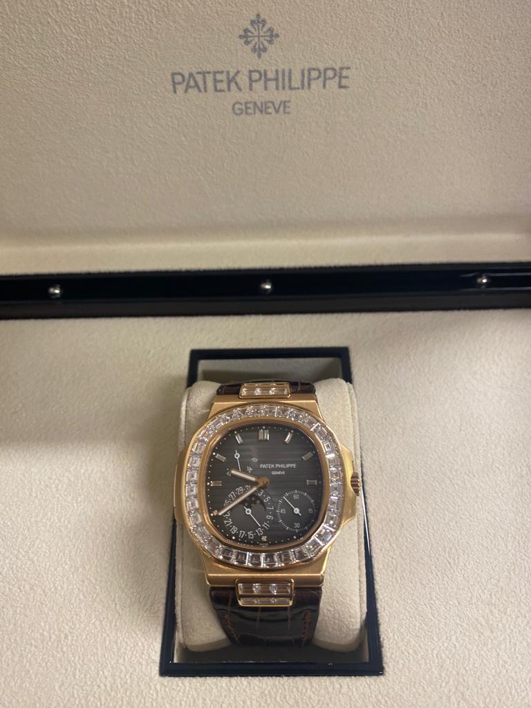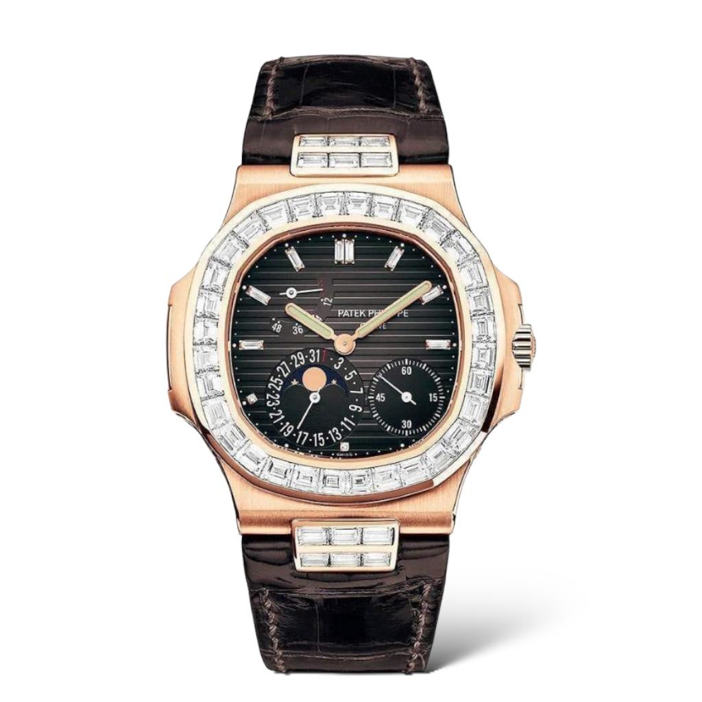 The Patek Philippe Nautilus 5724R isn’t just a watch, it’s a masterpiece. 40mm of gleaming rose gold hugs your wrist, its polished curves embracing a supple crocodile strap. Within, a moonphase complication dances with the rhythm of the heavens, whispering secrets in the soft luminescence of its sapphire window.