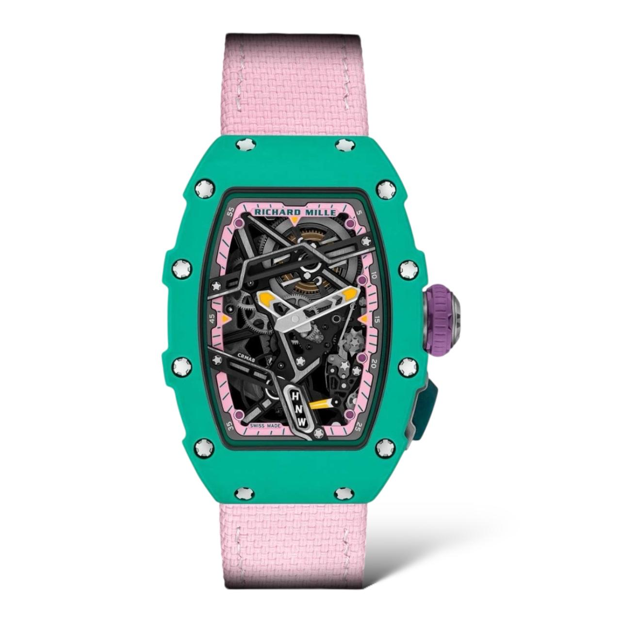 The Richard Mille RM 07-04 in Pink and Green combines cutting-edge design with luxury craftsmanship. Its lightweight Quartz TPT® case and skeletonized movement ensure durability and precision. Bold yet elegant, this timepiece is a perfect blend of performance and style.