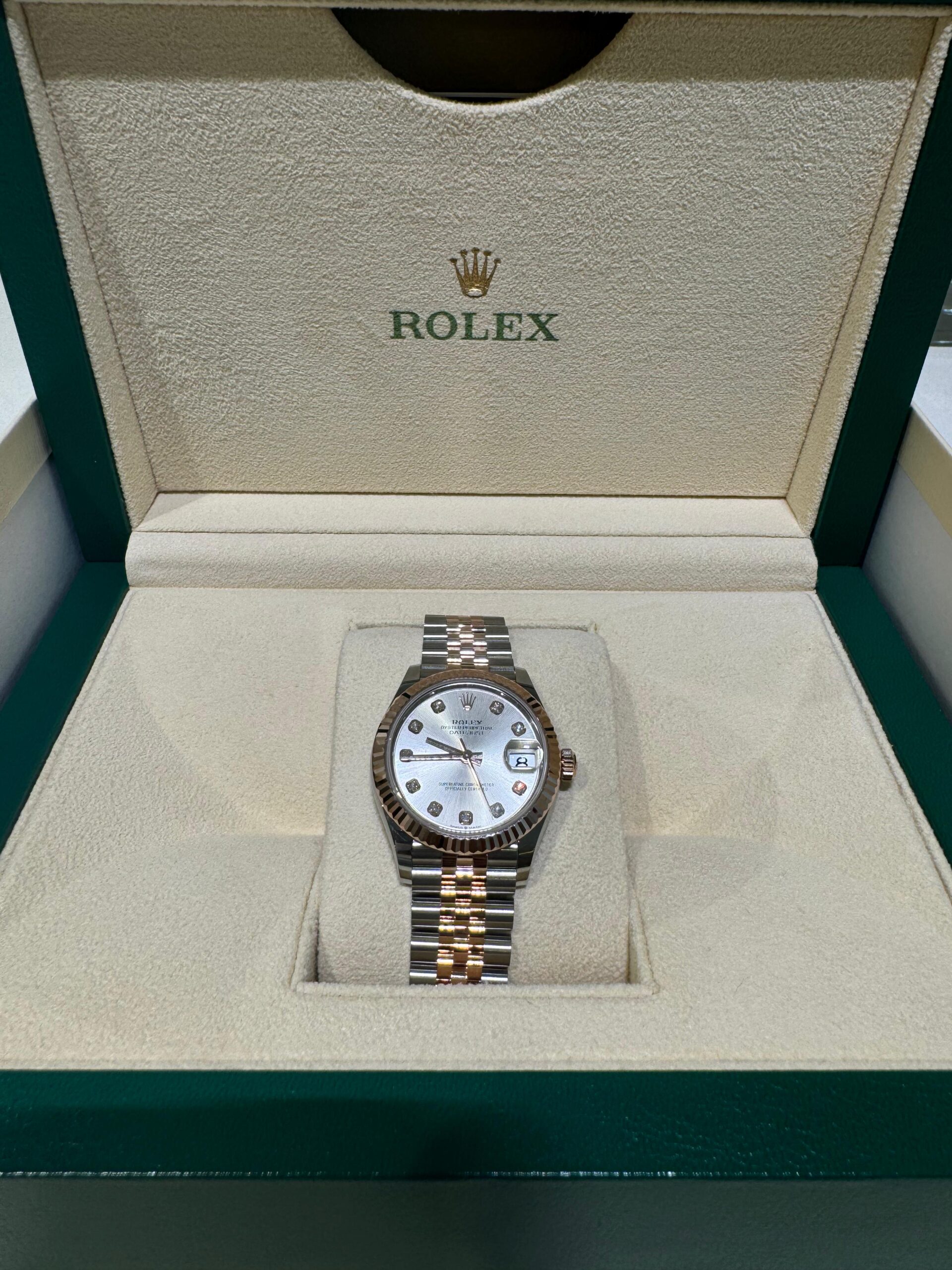 A stylish Rolex Datejust 31 mm (Ref. 278271) in luxurious two-tone Oystersteel and 18 ct Everose gold. It features a crisp white dial with easy-to-read hour markers and the signature date display with a Cyclops magnifier at 3 o’clock. Housed in a 31 mm Oyster case with a refined Everose gold fluted bezel, it’s paired with a comfortable and elegant Jubilee bracelet — a perfect blend of classic Rolex design and everyday sophistication.