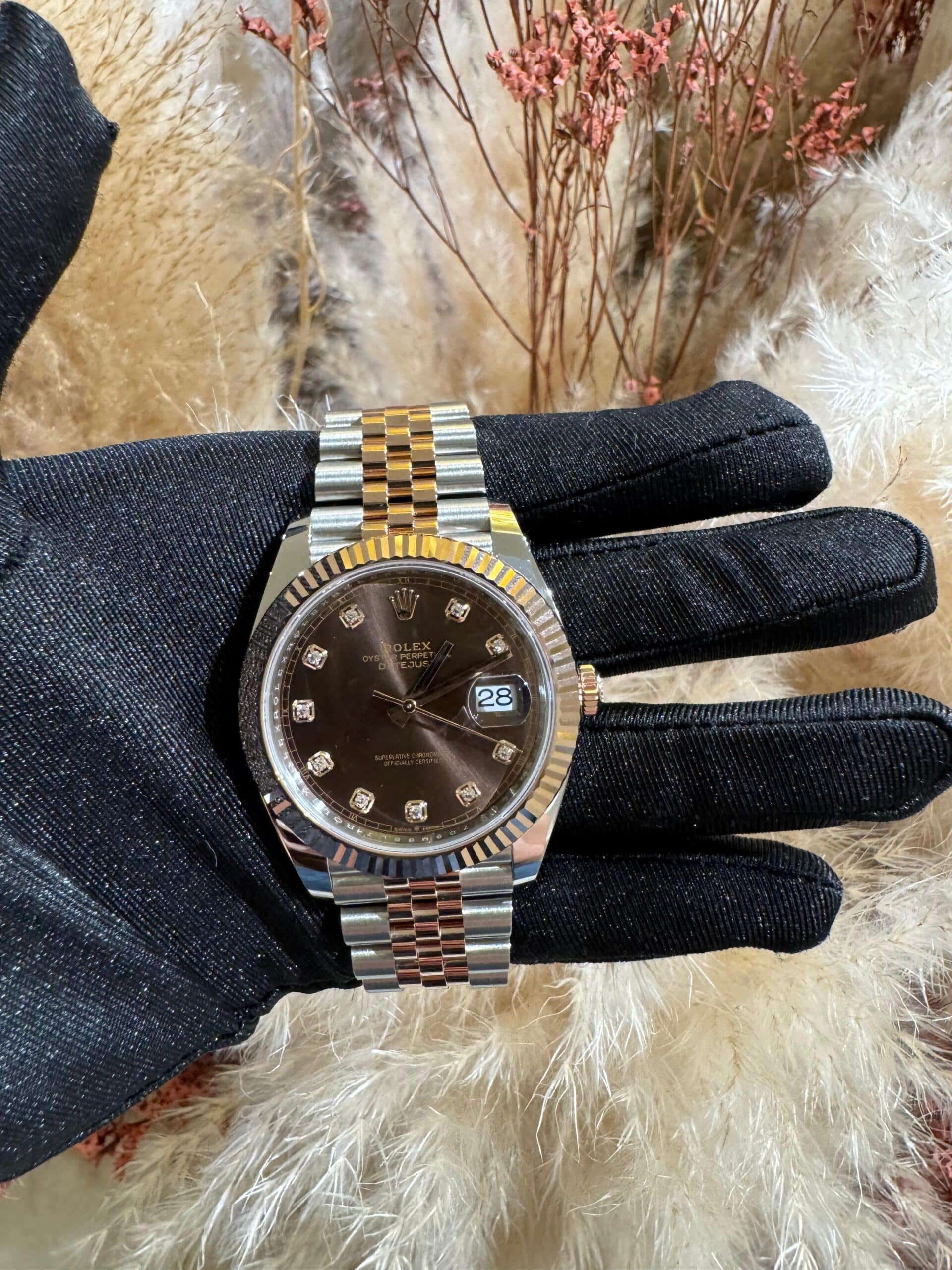 The Rolex Datejust 41 ref. 126331-004 showcases a 41mm Oystersteel and Everose gold case, fluted bezel, and a chocolate dial set with diamond hour markers. Powered by the Caliber 3235 automatic movement, it offers a 70-hour power reserve and comes on a luxurious Jubilee bracelet. A perfect blend of elegance and precision.