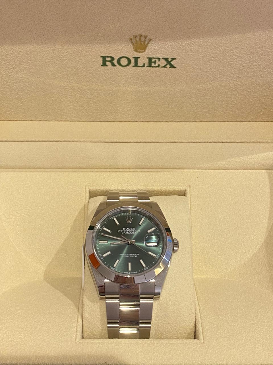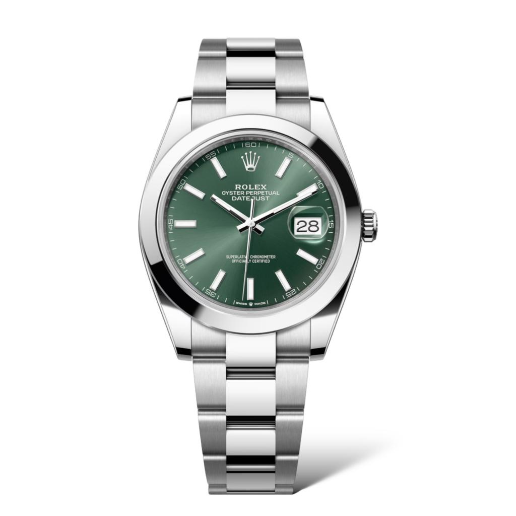 Command attention with the Rolex Datejust 41 in captivating mint green. This 41mm Oystersteel masterpiece boasts a fluted bezel, self-winding movement, and iconic date window. The Oyster bracelet offers unmatched comfort, while the mint green dial adds a touch of modern flair.