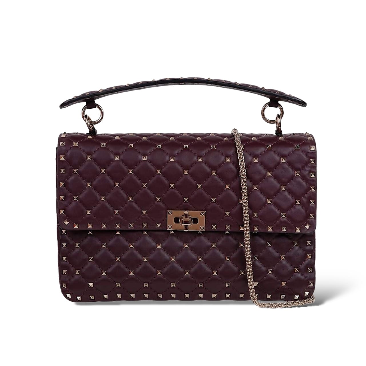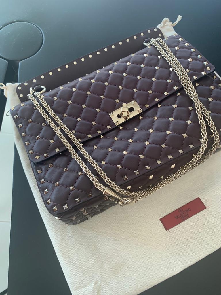The Valentino Quilted Leather Rockstud Spike in Rouge (red) is a statement piece that exudes luxury and edgy sophistication. Crafted from supple quilted leather, this large-sized bag features the iconic Rockstud detailing, adding a bold and glamorous touch. Perfect for adding a pop of color to any outfit, this bag is both chic and versatile, making it an essential accessory for the fashion-forward individual.