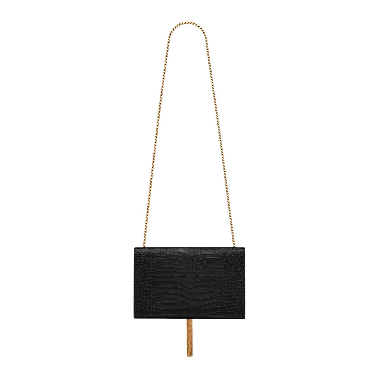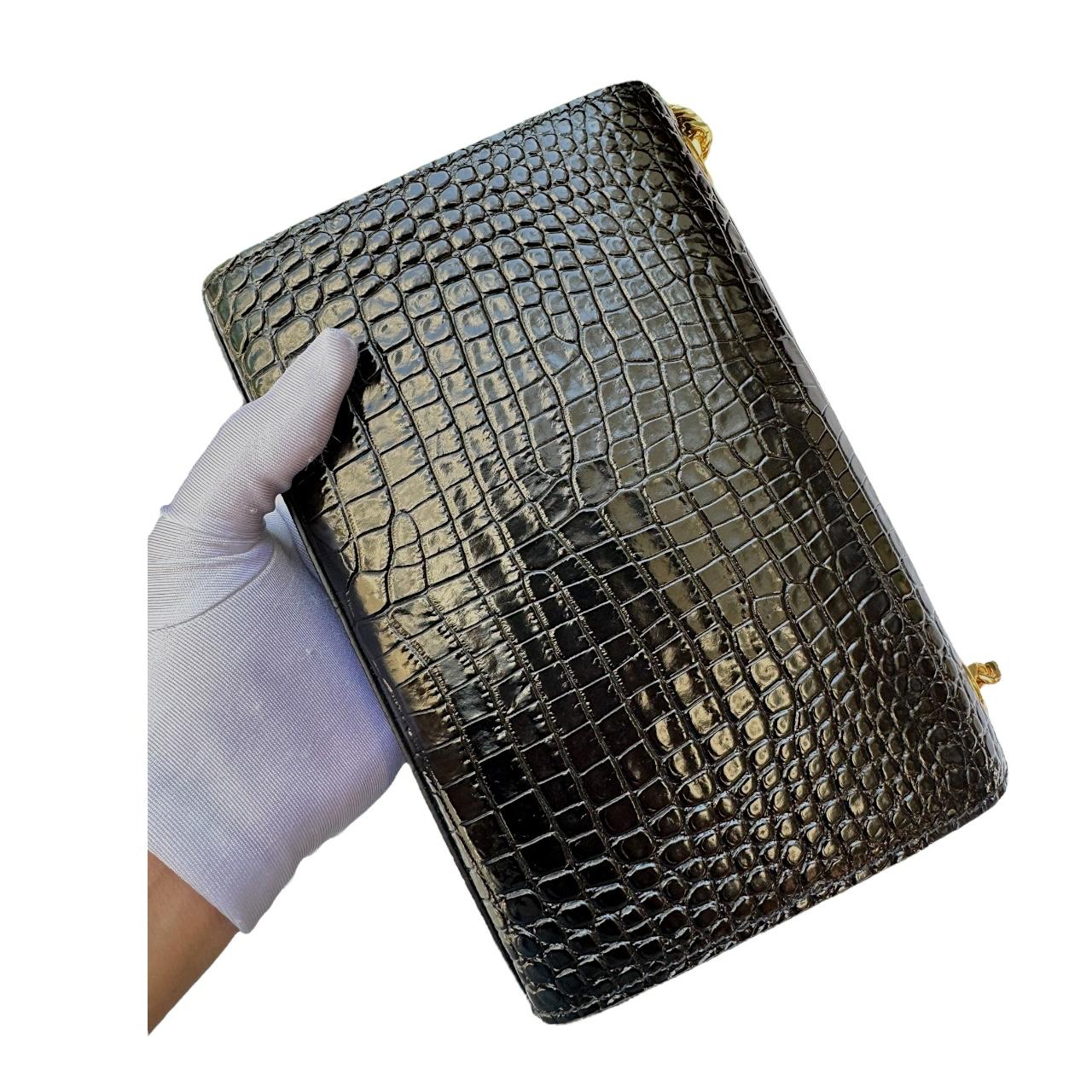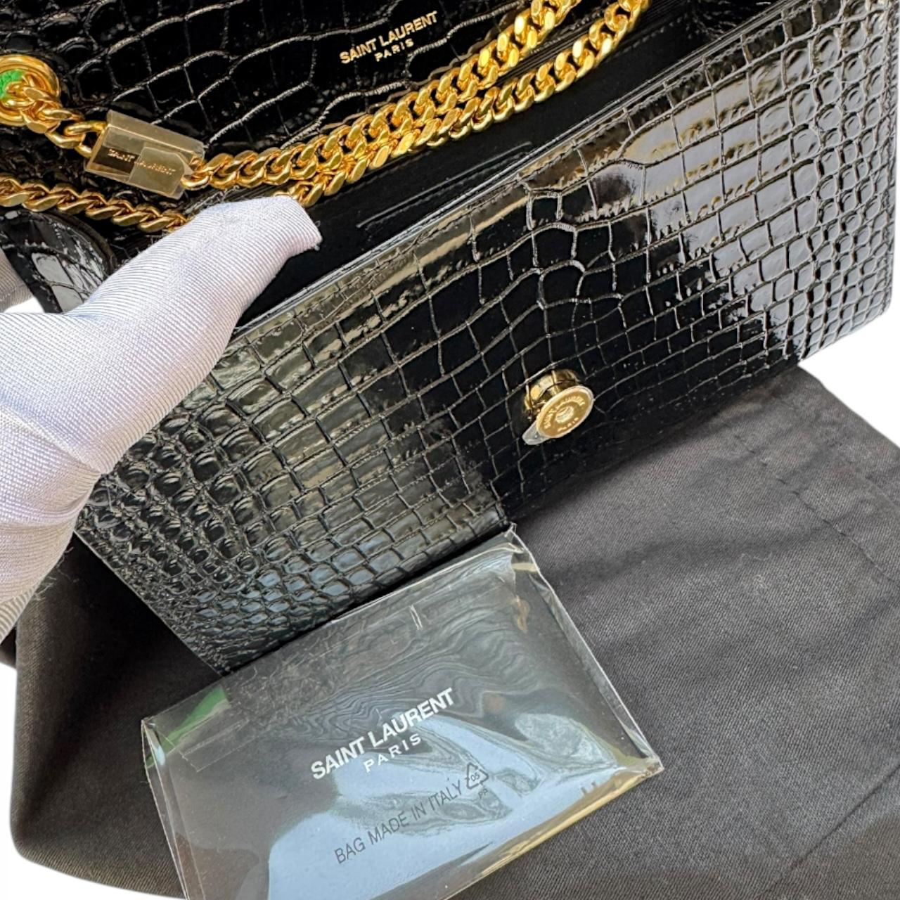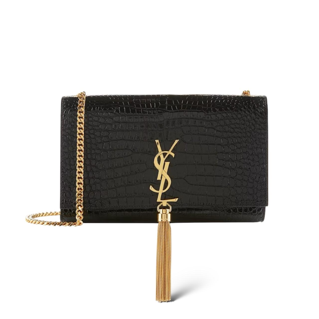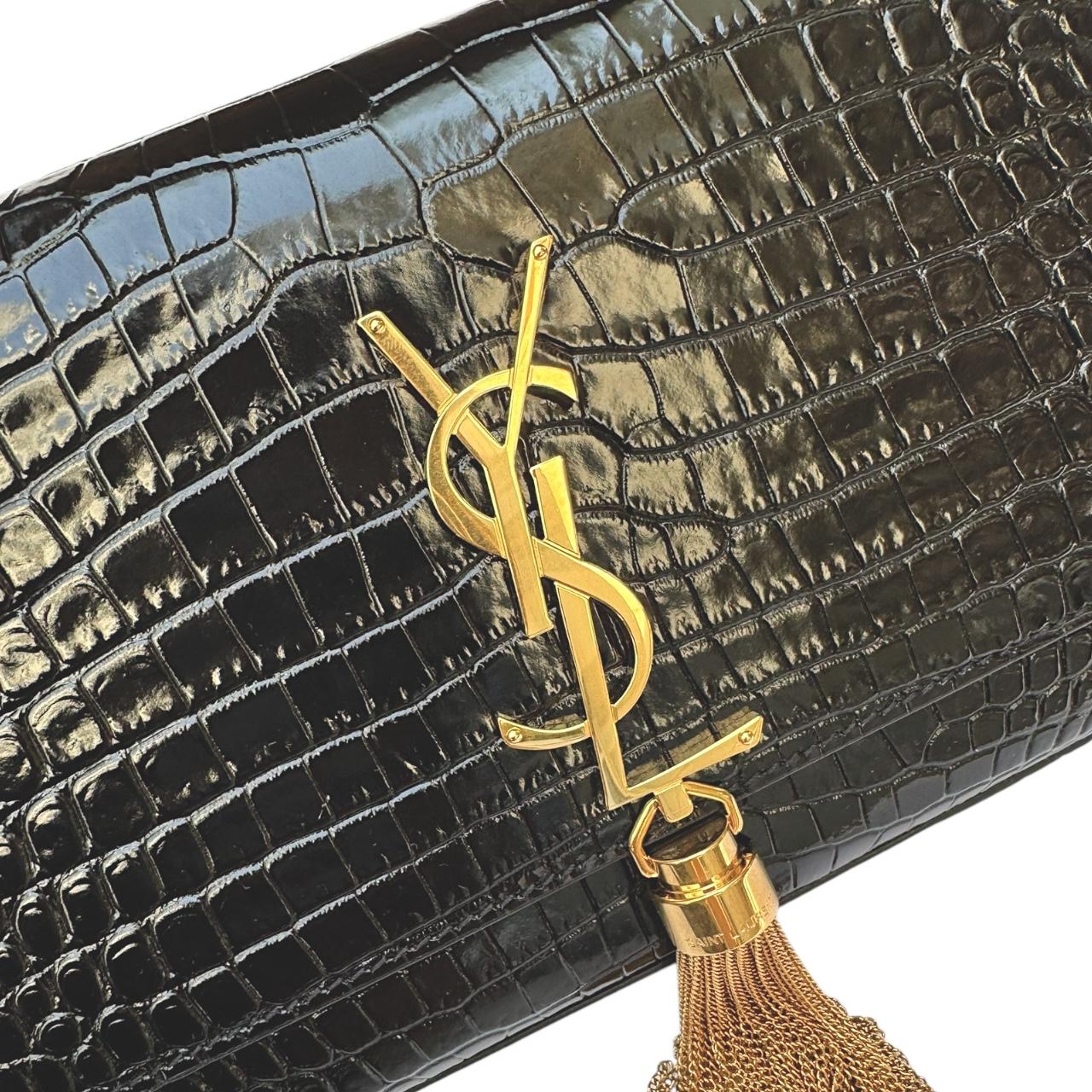 The YSL Kate Medium Tassel Bag in Black Crocodile-Embossed Leather is a timeless and glamorous accessory that embodies Saint Laurent’s signature elegance and sophistication. Crafted from crocodile-embossed leather, the bag features a luxurious texture with a glossy finish, adding depth and a striking visual appeal to its sleek silhouette.