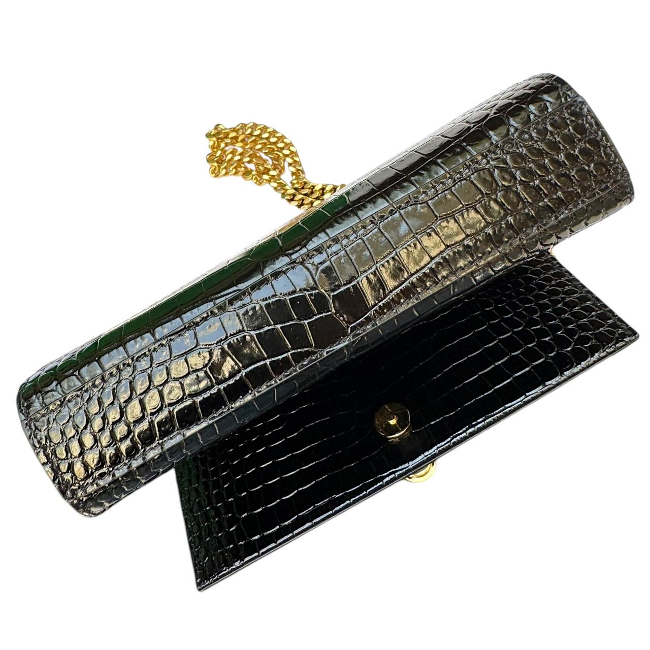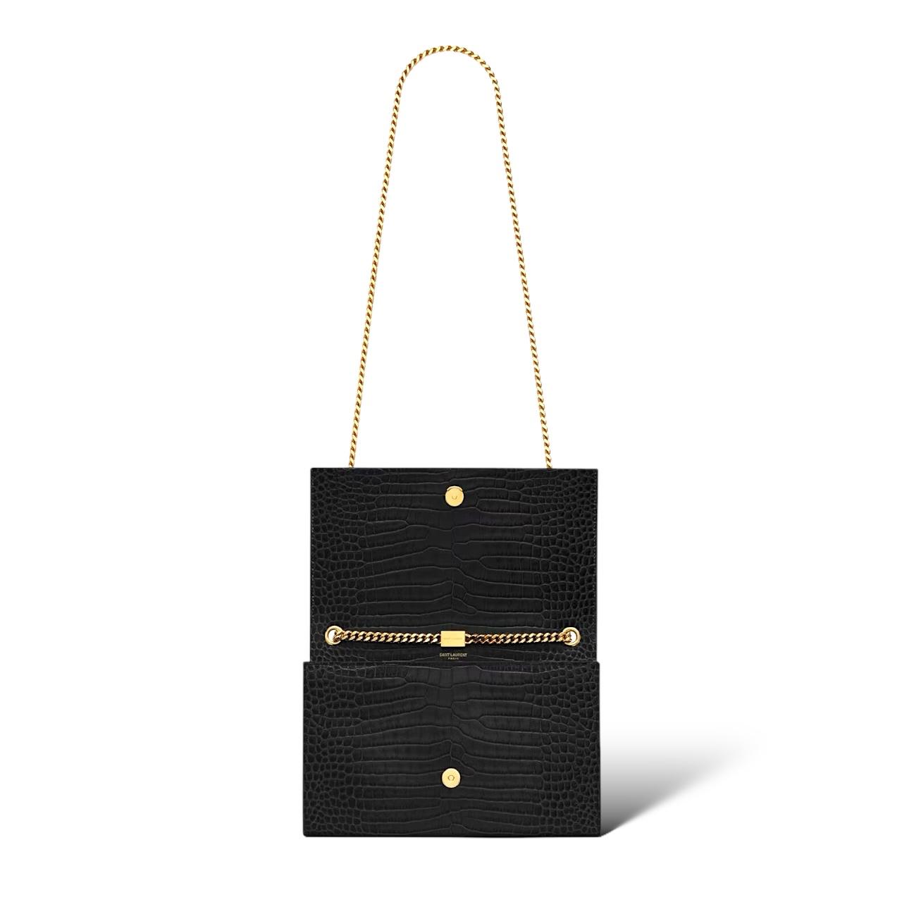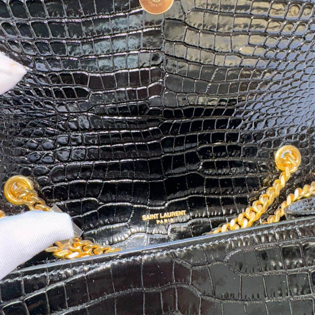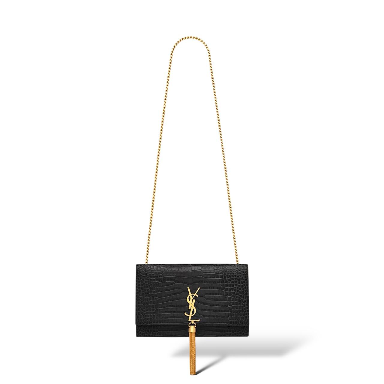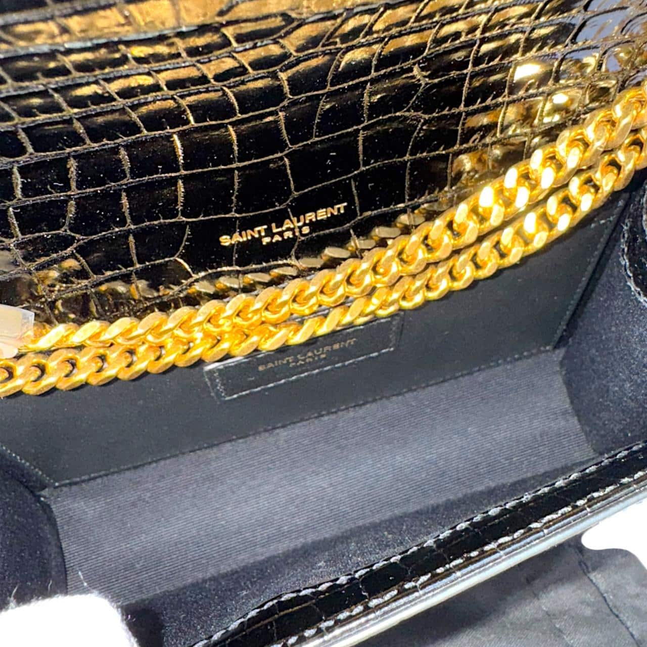 The YSL Kate Medium Tassel Bag in Black Crocodile-Embossed Leather is a timeless and glamorous accessory that embodies Saint Laurent’s signature elegance and sophistication. Crafted from crocodile-embossed leather, the bag features a luxurious texture with a glossy finish, adding depth and a striking visual appeal to its sleek silhouette.